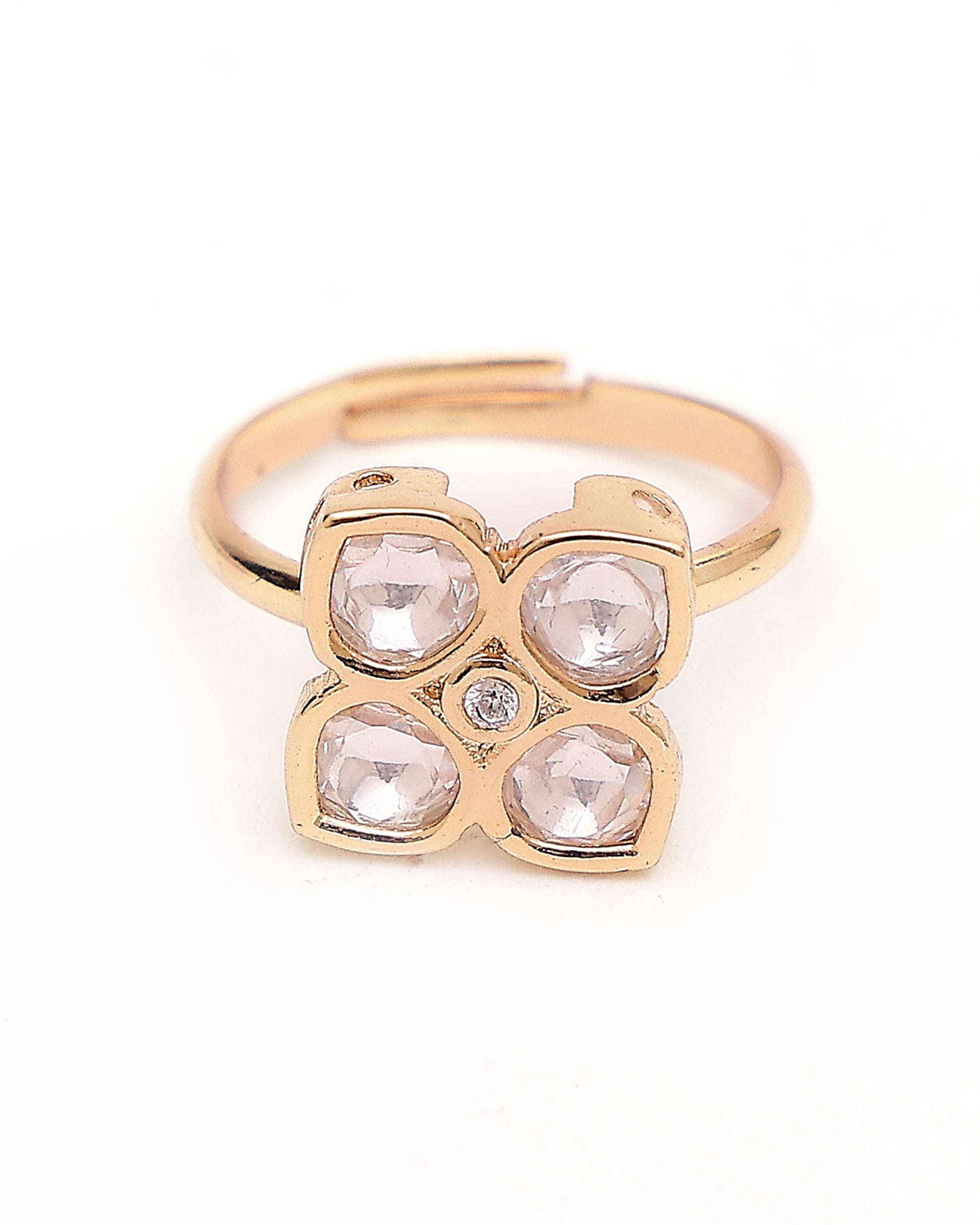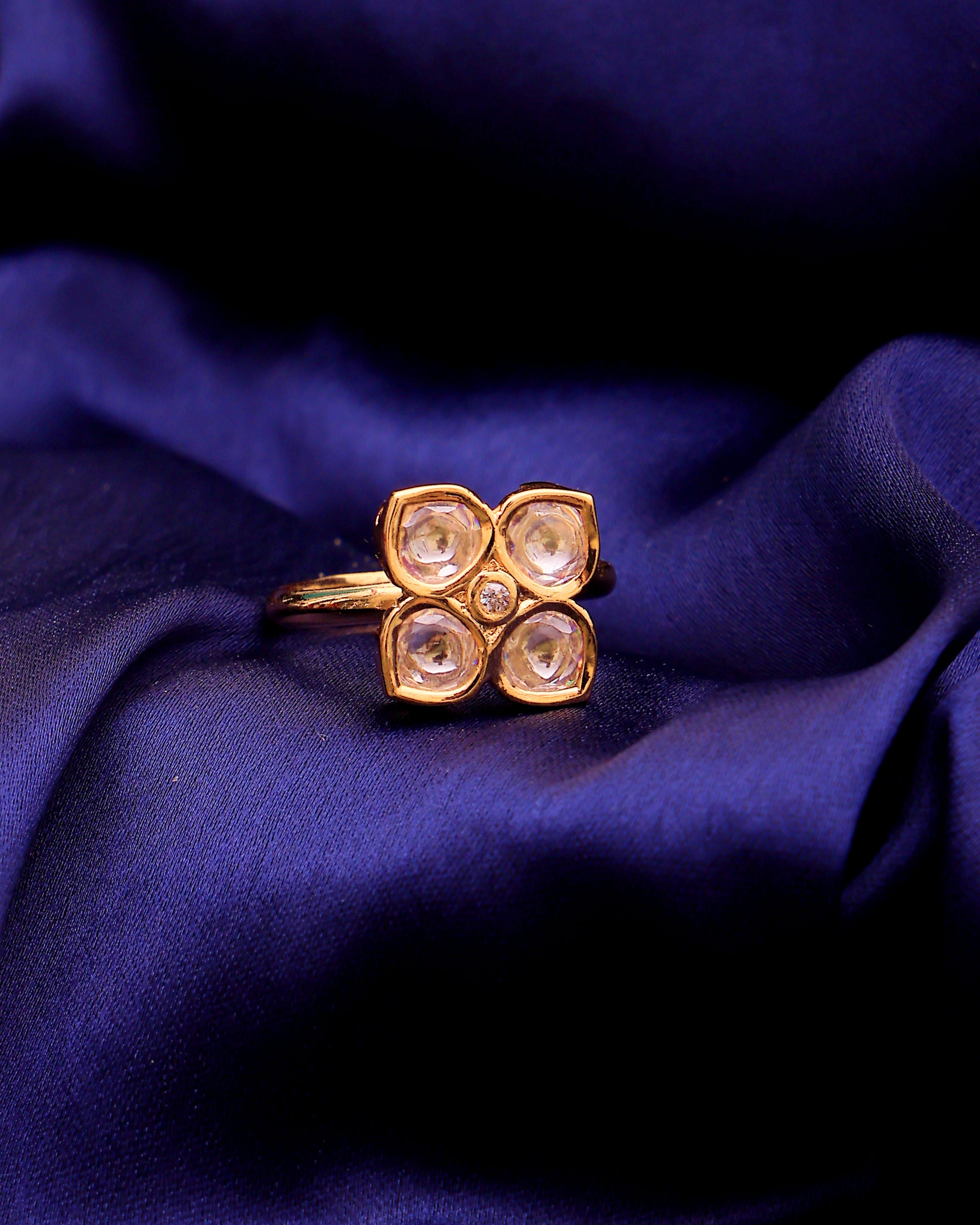 A delicate nod to heritage with a touch of contemporary finesse,the Chandrika Bloom Moissanite Ring features a floral-inspired cluster of four glistening moissanite stones arranged in a perfect cross bloom. Set in a lustrous gold-finish adjustable band, this piece merges age-old elegance with modern minimalism.