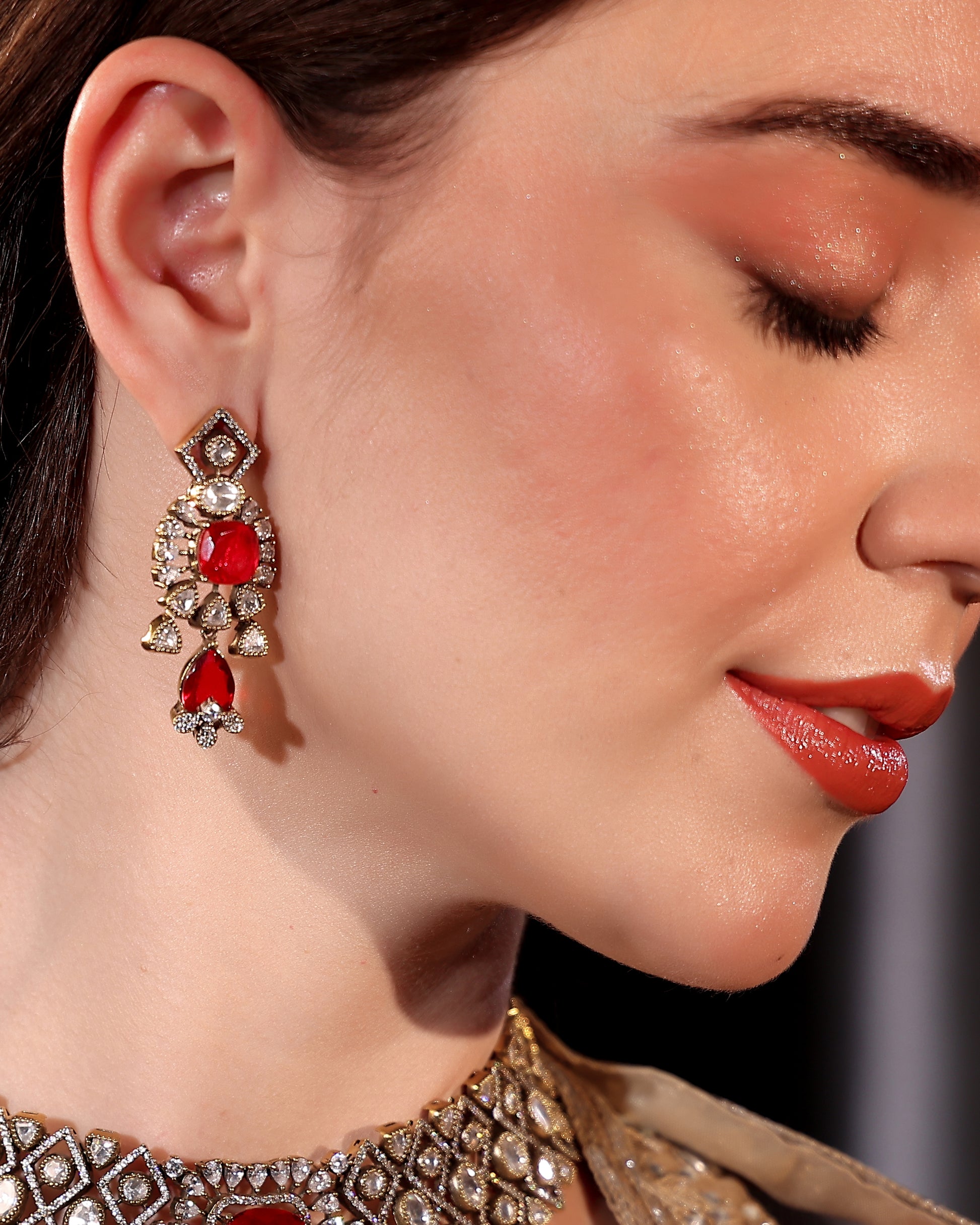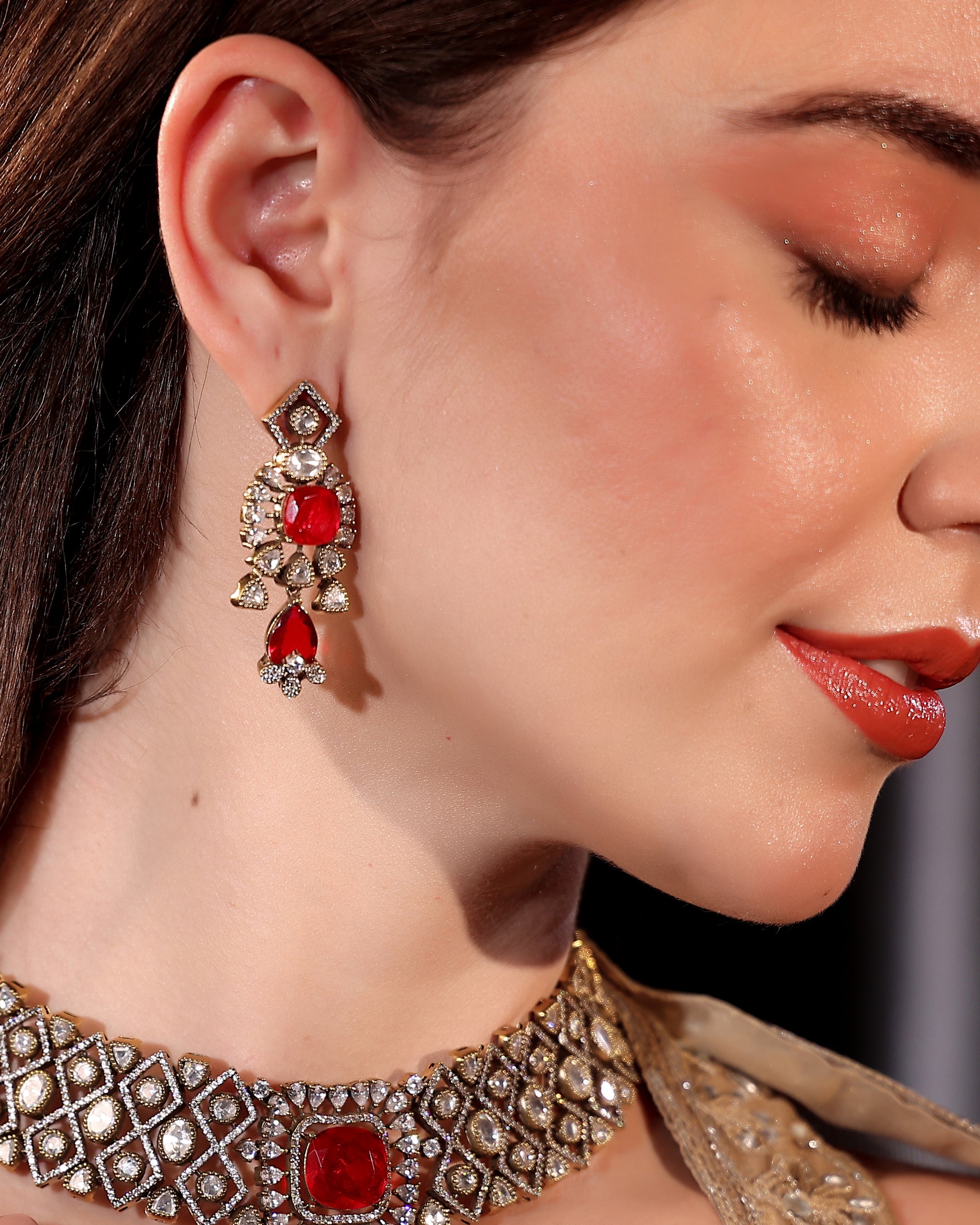 Unleash the allure of timeless grandeur with the Crimson Glint Set, where vivid red stones meet the shimmering charm of moissanite. This dramatic choker set is a tribute to opulent heritage, crafted to leave a lasting impression at every festive gala or wedding celebration.