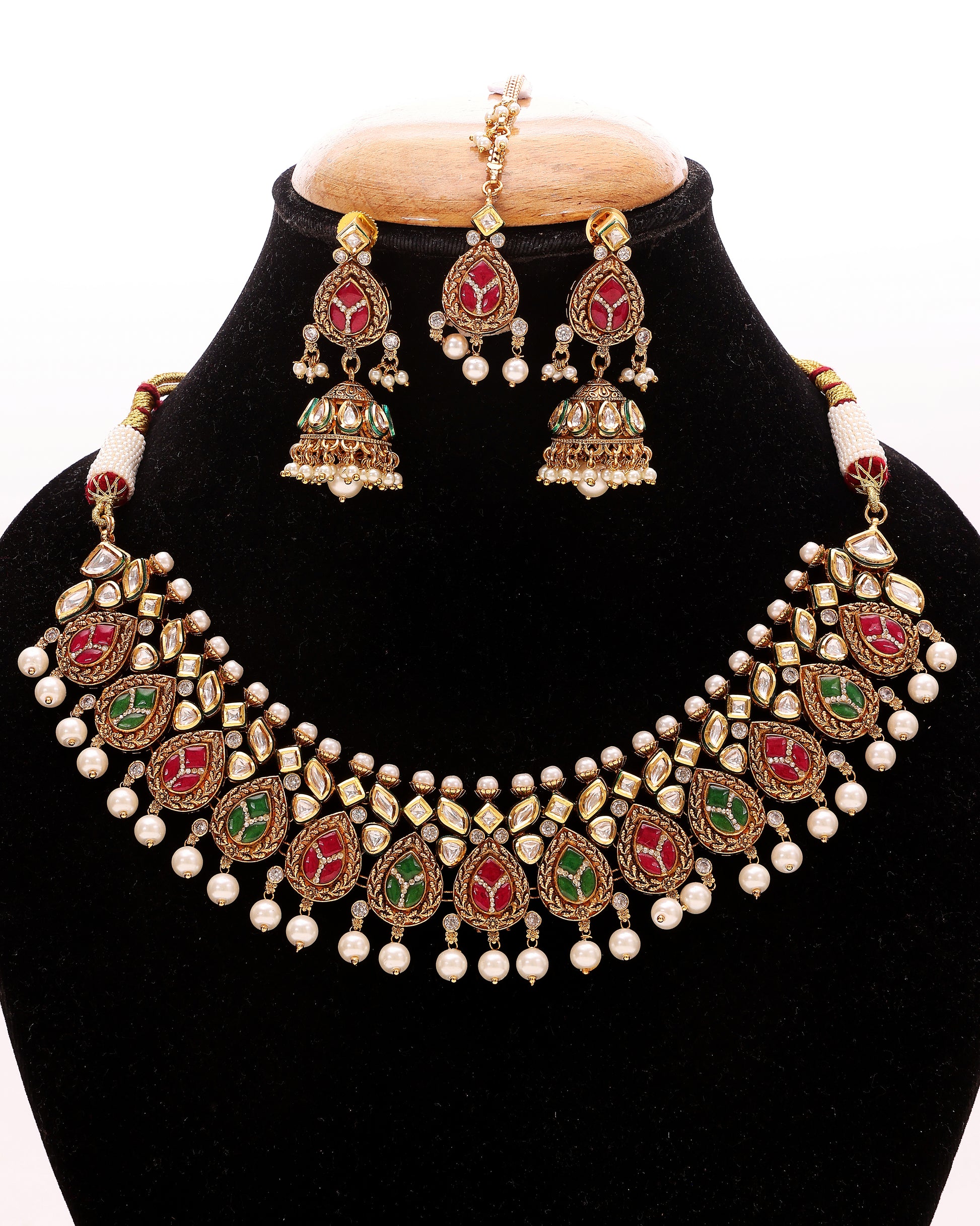 Celebrate grandeur with the Festive Royale Set, a breathtaking ensemble blending traditional Jadau artistry with colorful enamel accents. This set is a testament to intricate craftsmanship, ideal for festive occasions, weddings, or heirloom collections.