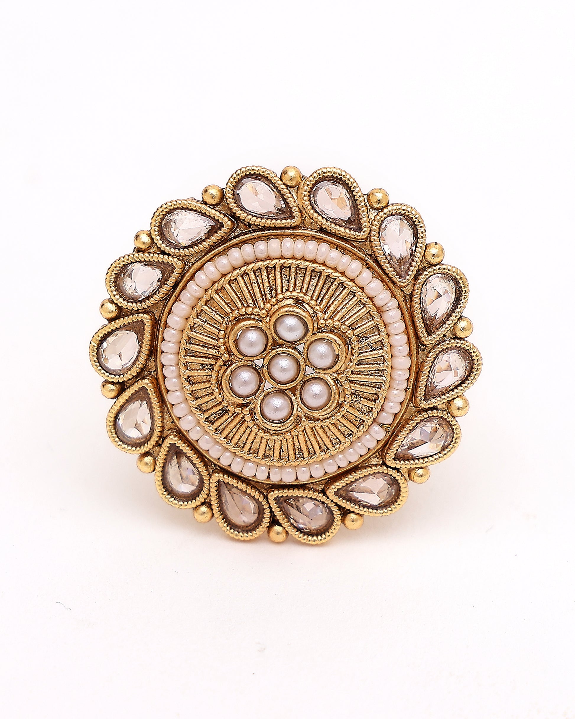 Step into timeless grace with the Gulnoor Antique Kundan Pearl Ring, a radiant fusion of regal charm and traditional artistry. Designed in a rich antique gold finish, the ring features a floral center crafted from delicate faux pearls, encircled by a medley of intricate kundan teardrops — reminiscent of royal Mughal gardens.