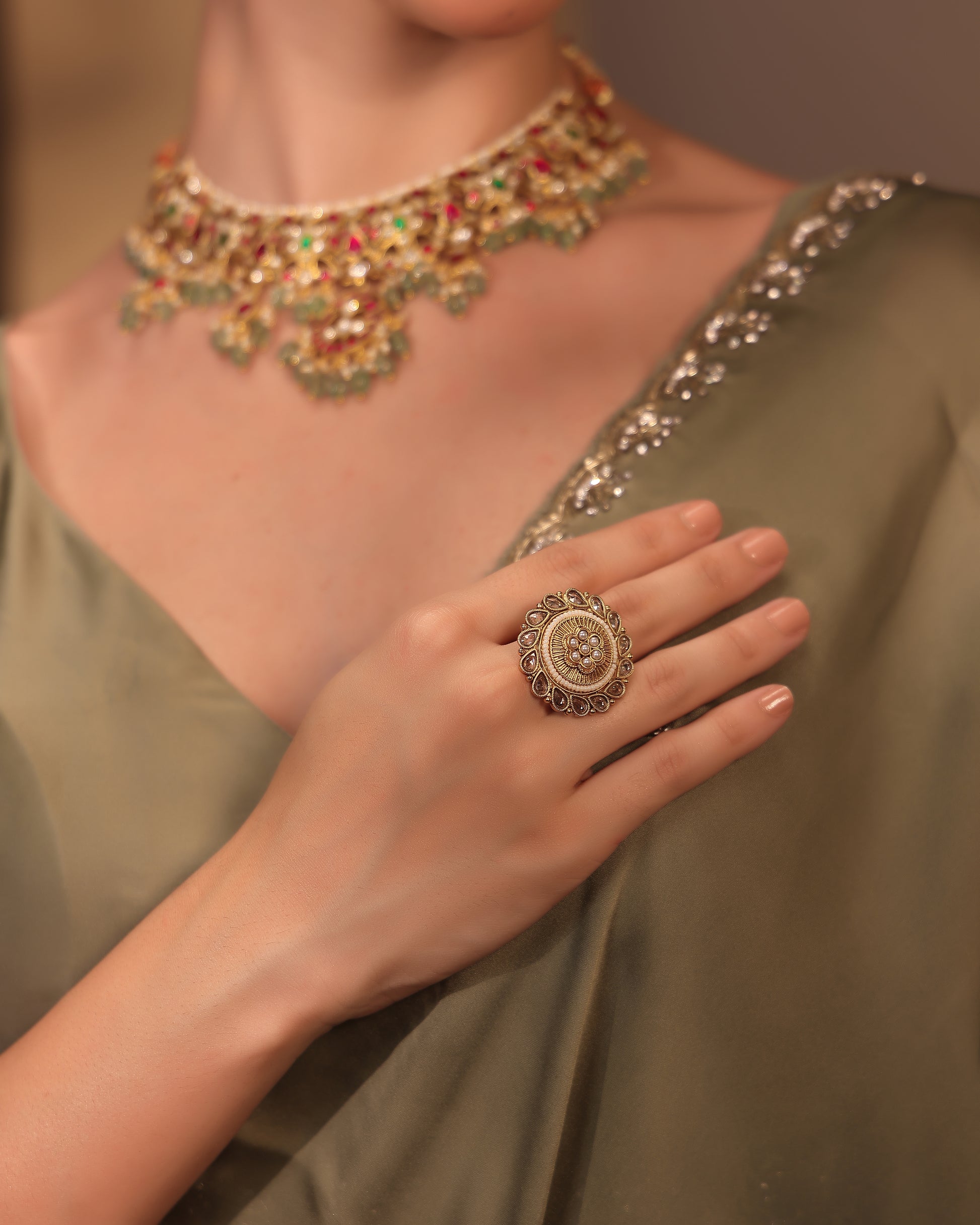 Complement it with kundan chandbalis or a pearl choker for an elevated ethnic look. Pairs exquisitely with silk sarees, shararas, or lehengas.