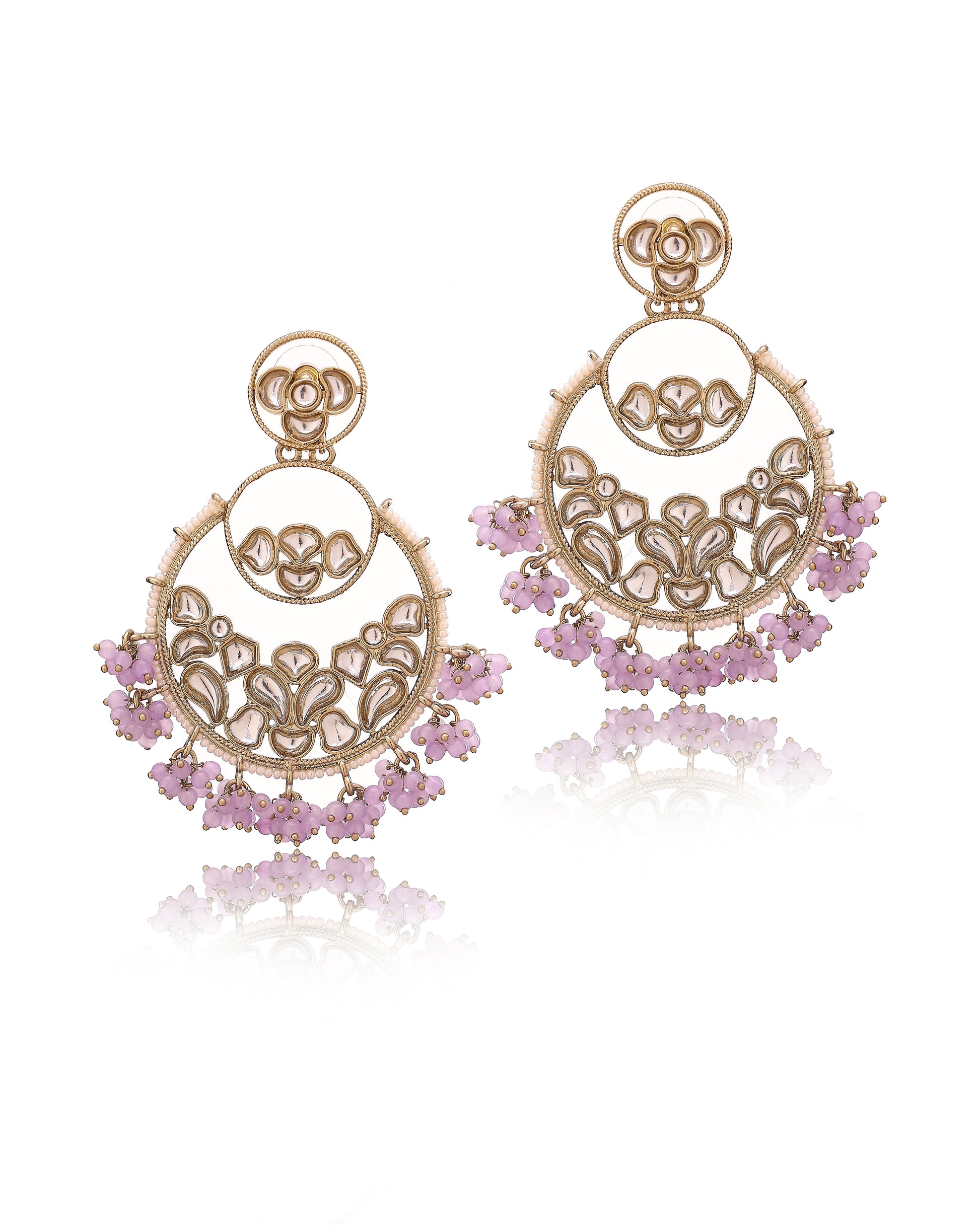 Dual open hoops with a central crescent formation, embellished with mirror-finish kundan style stones, surrounded by intricate wirework and clusters of soft lilac beads that sway with elegance.