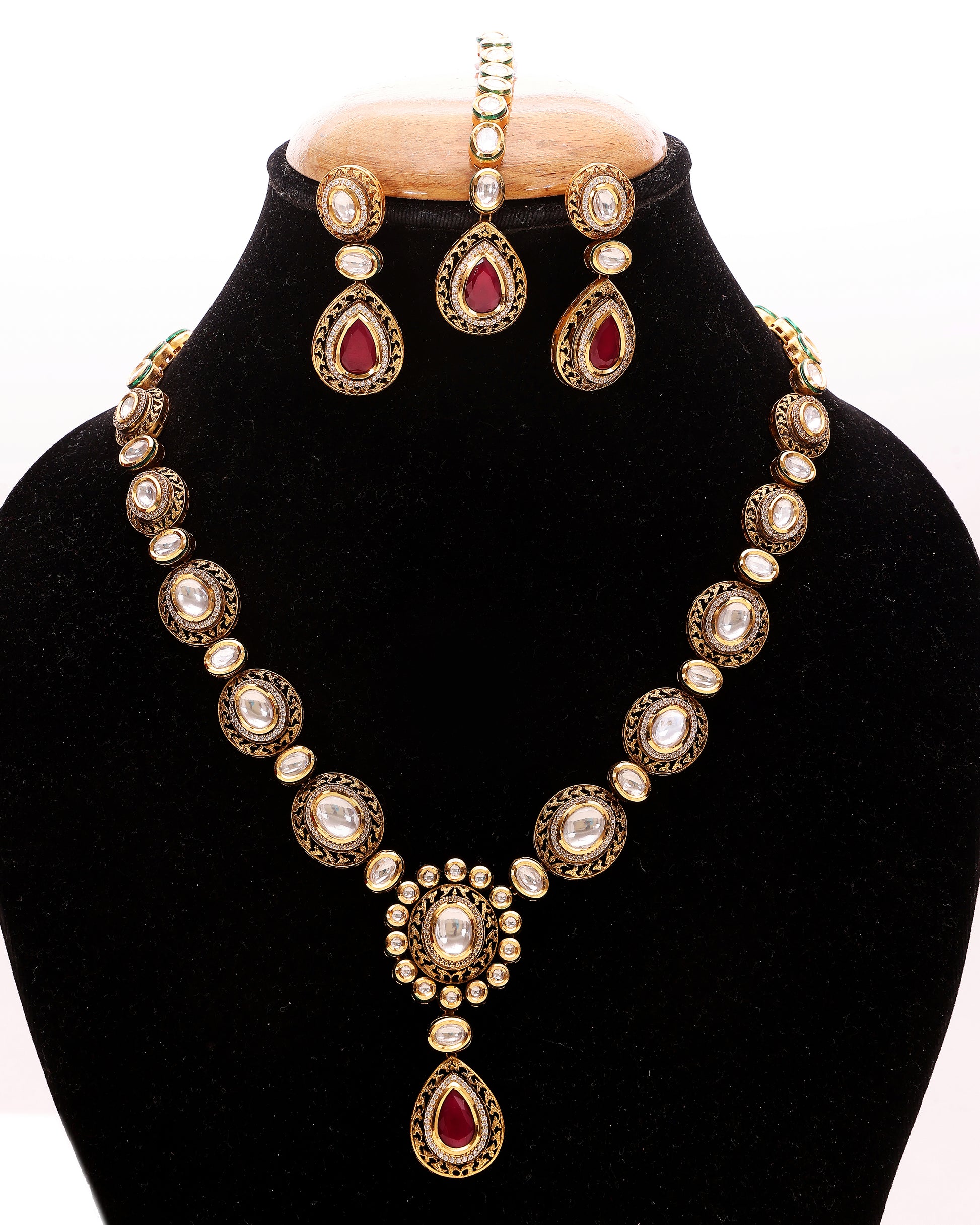 • Traditional Kundan-style layout with high-polish antique gold finish