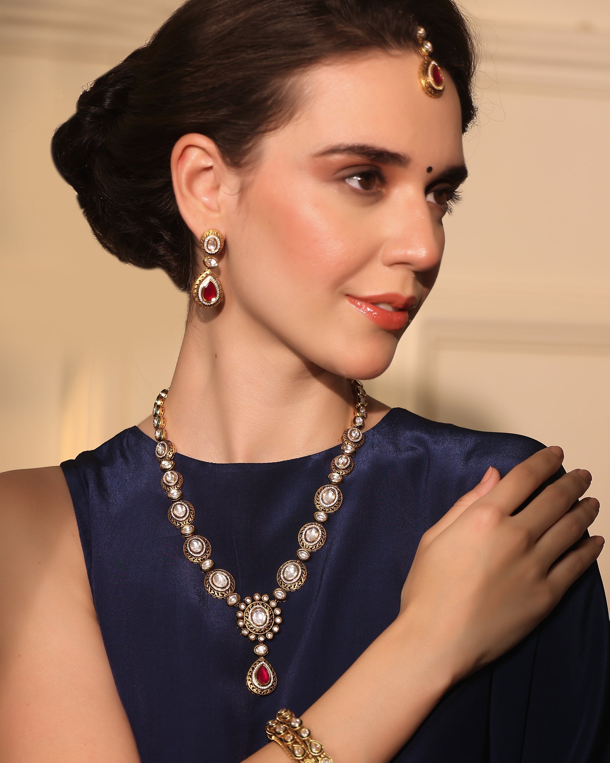 A regal tribute to Rajasthani grandeur, the Jharvani Moissanite Ruby-Filigree Bridal Set is steeped in vintage charm. Combining the brilliance of moissanite with deep ruby enamel and intricate filigree work, this set brings age-old craftsmanship into the spotlight for the modern bride.