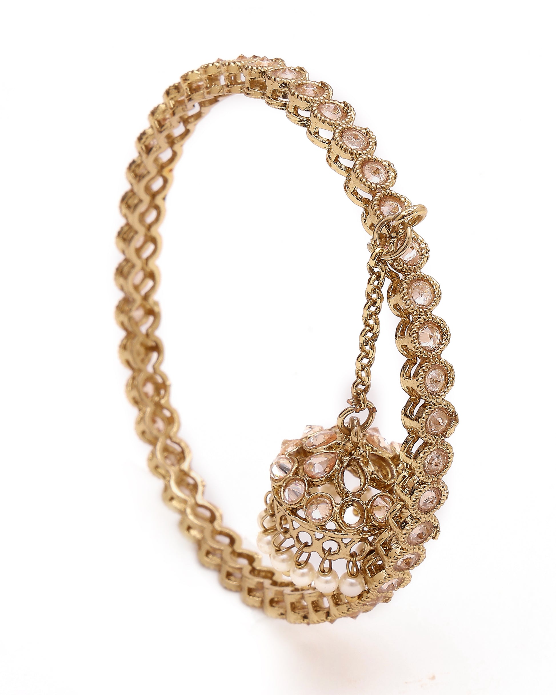 Elevate your ethnic look with this exquisite gold-toned bangle adorned with dazzling kundan stones and a delicate hanging jhumka charm. A perfect fusion of tradition and elegance, this bangle transforms your wristwear into a showstopper.