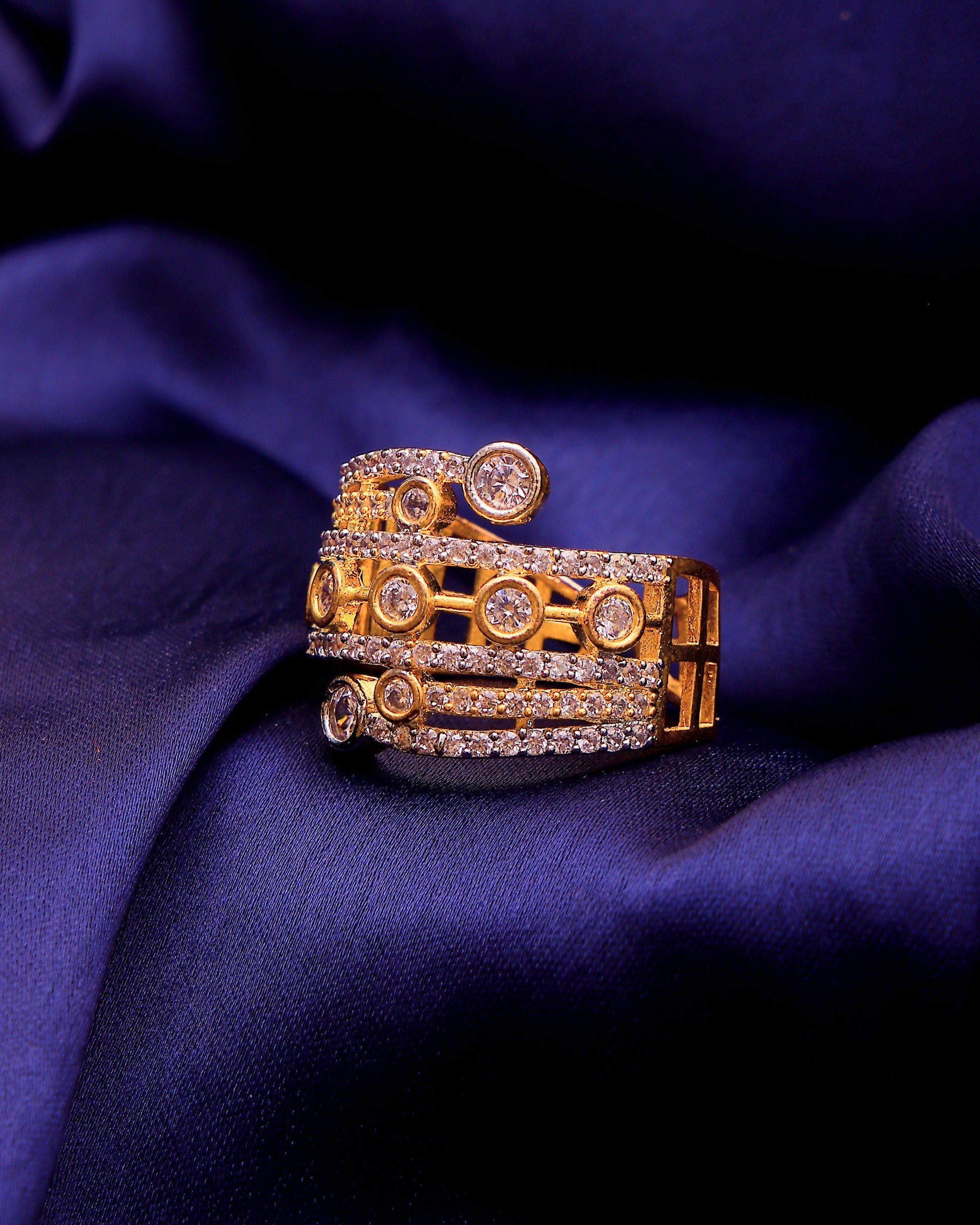 Step into the spotlight with the Liora Gold Statement Ring, a bold and radiant piece designed for those who dare to dazzle. Sculpted in a wide-band open cuff silhouette, this ring features alternating rows of shimmering crystals and bezel-set stones, catching the light from every angle with a golden glow.