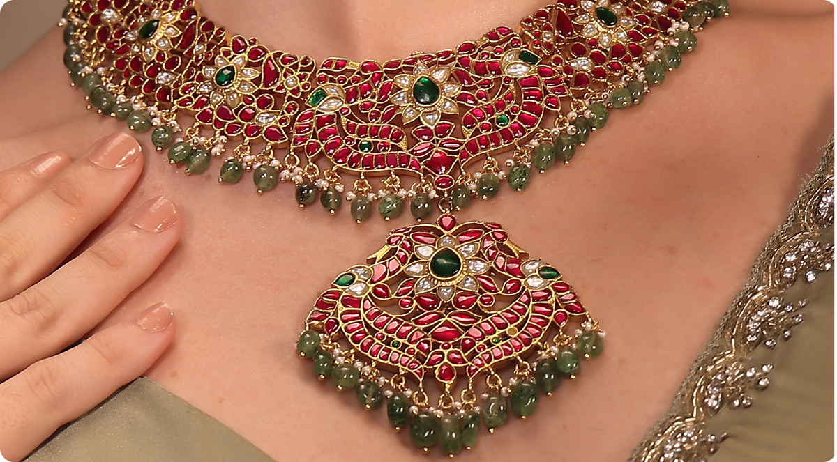 Steeped in the grandeur of vintage Rajputana and Mughal-era artistry, the Maharani Meenakari Heirloom Choker is a statement of legacy reimagined. It celebrates the opulence of 18th-century court jewellery with a majestic lattice of floral bursts, paisley elements, and hand-painted enameling. The palette—anchored in regal ruby enamel and contrasted with deep emerald accents—draws the eye to a cascade of meticulously placed motifs that seem to tell a forgotten royal tale. With a broad silhouette and an oversized, temple-style pendant, this choker becomes less of an accessory and more of an heirloom reinterpreted.