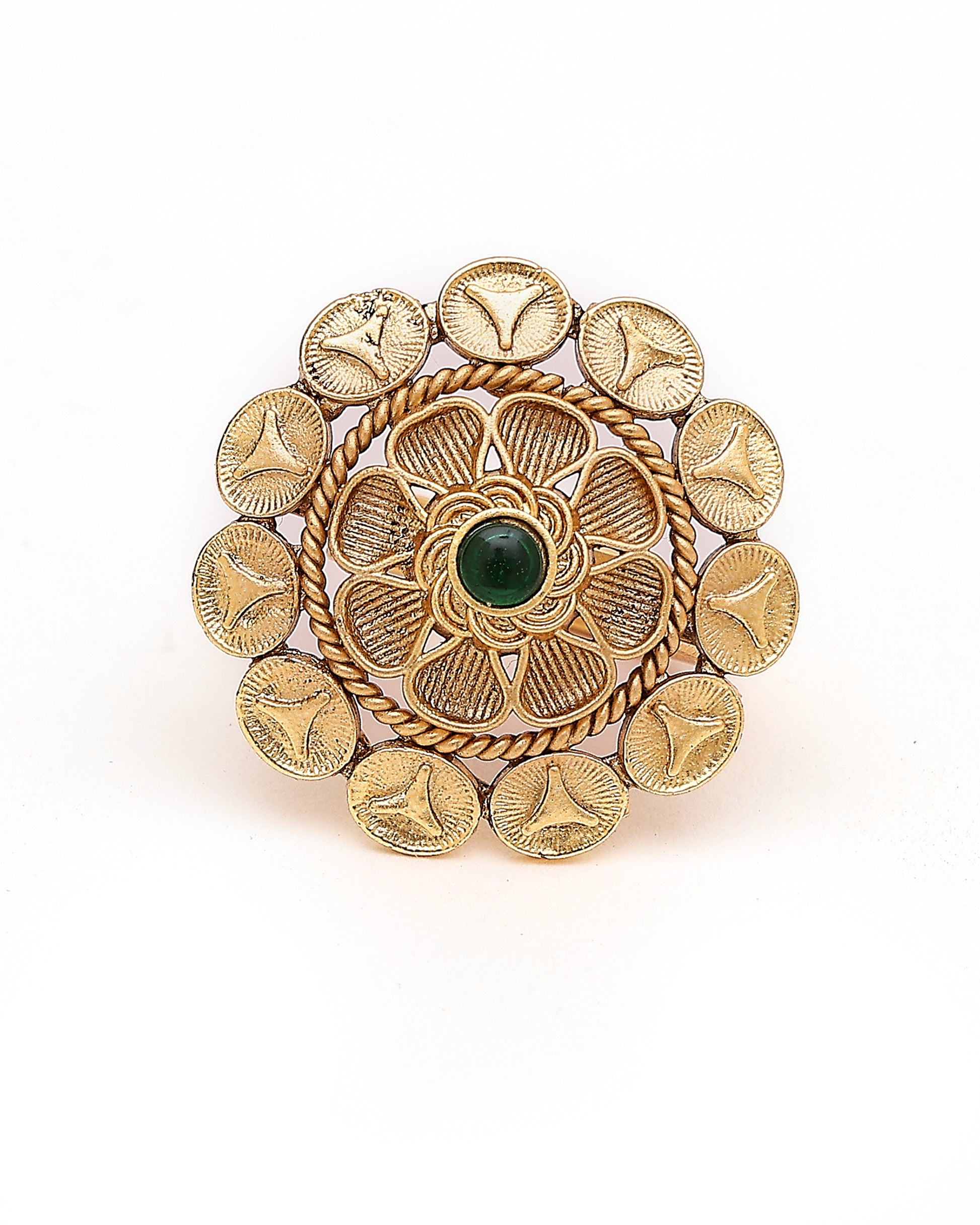 Celebrate the timeless beauty of lotus symbolism with the Padmika Antique Lotus Ring, a handcrafted masterpiece inspired by heritage and spiritual grace. Featuring intricate motifs in a floral mandala structure, this ring showcases a central green gemstone surrounded by engraved lotus petal detailing — a true homage to sacred design.