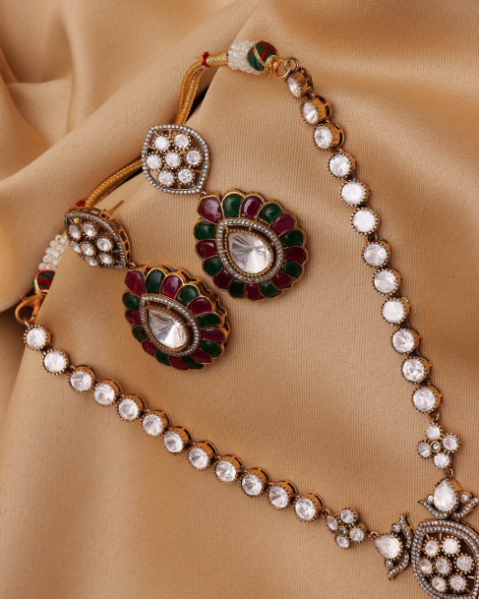 Delicate artistry meets royal charm in the Peacock Fleur Moissanite Enamel Set. This refined ensemble combines traditional motifs with modern finesse, featuring vivid enamel petals that radiate from brilliant moissanite stones—much like the majestic plumage of a peacock in bloom.