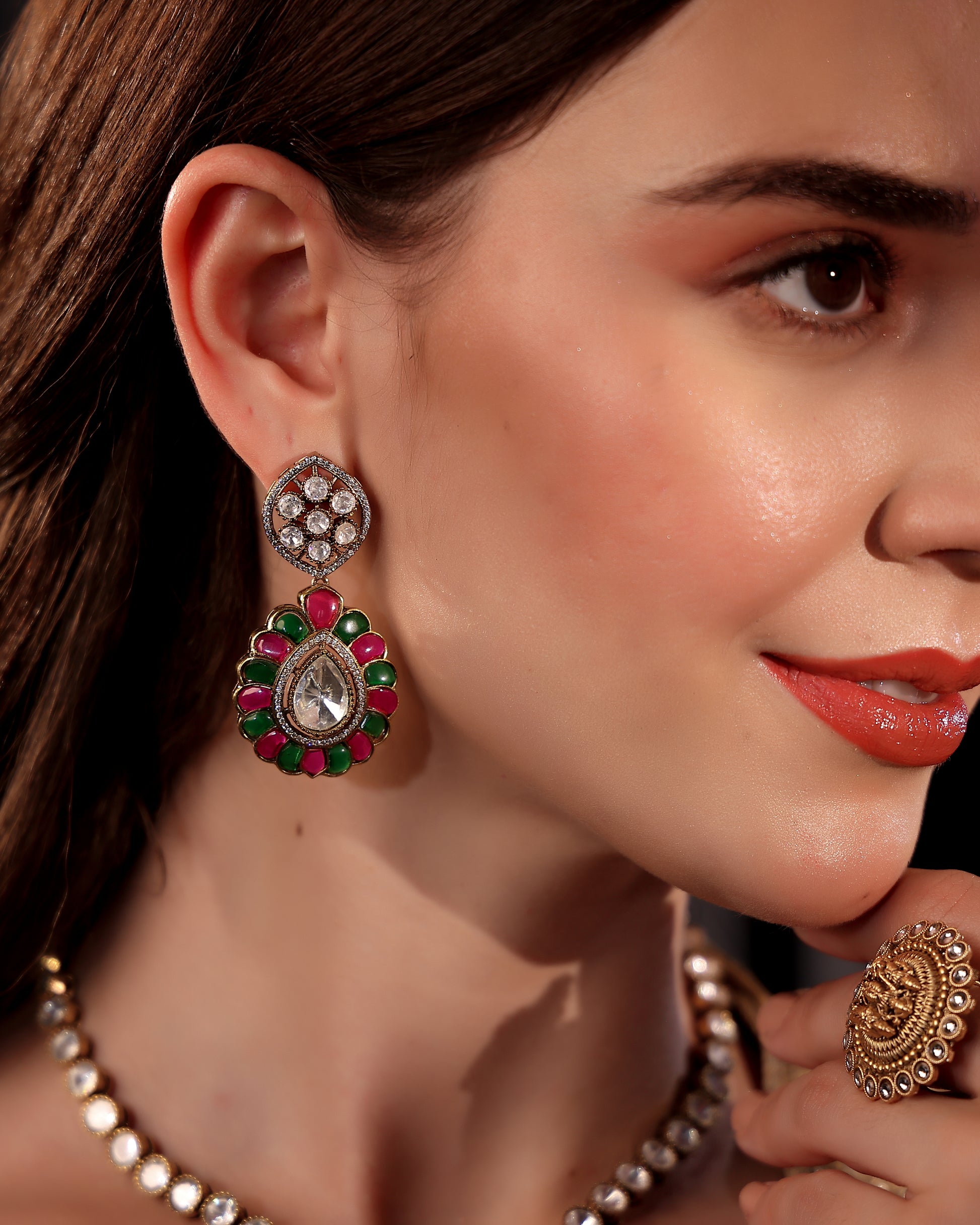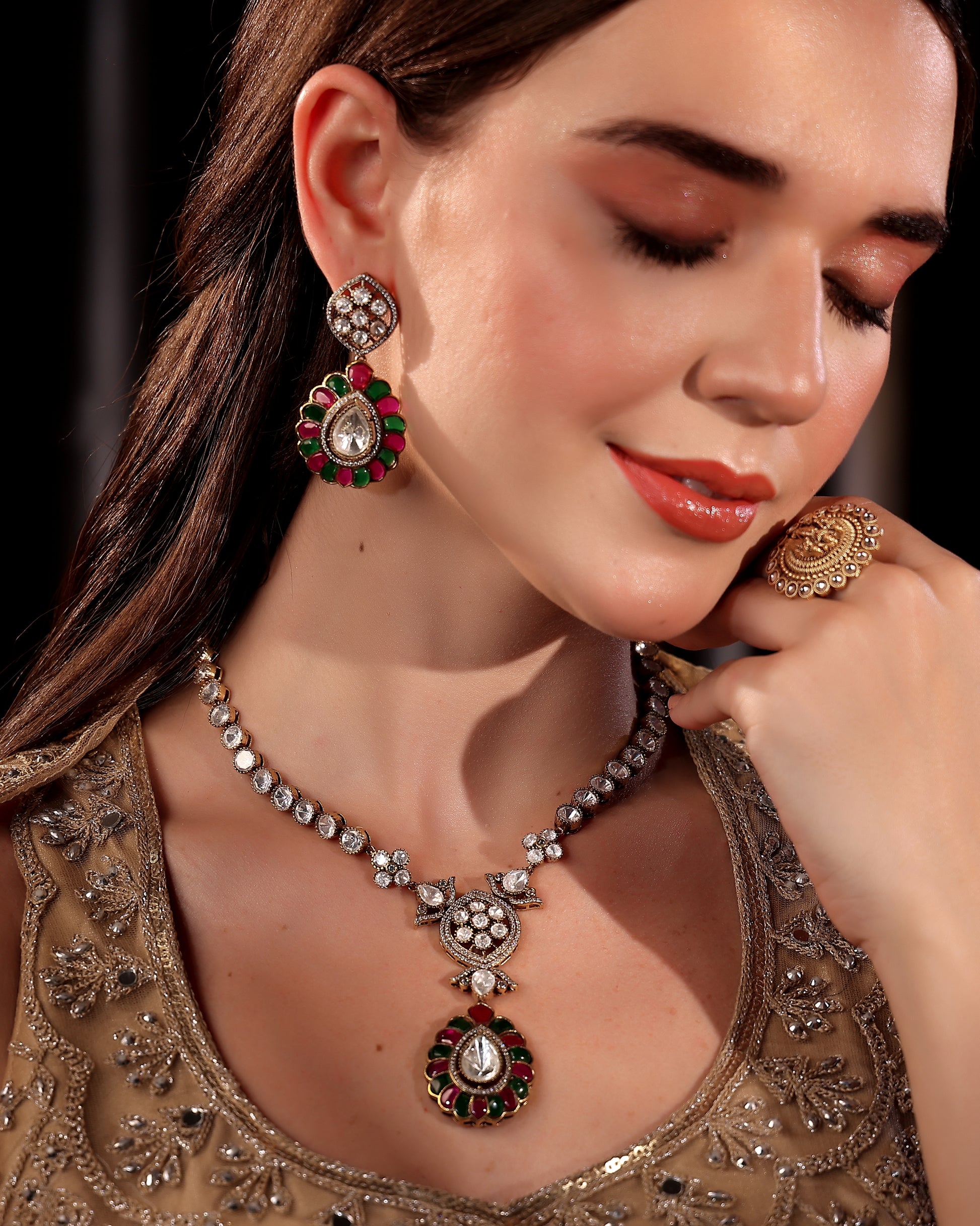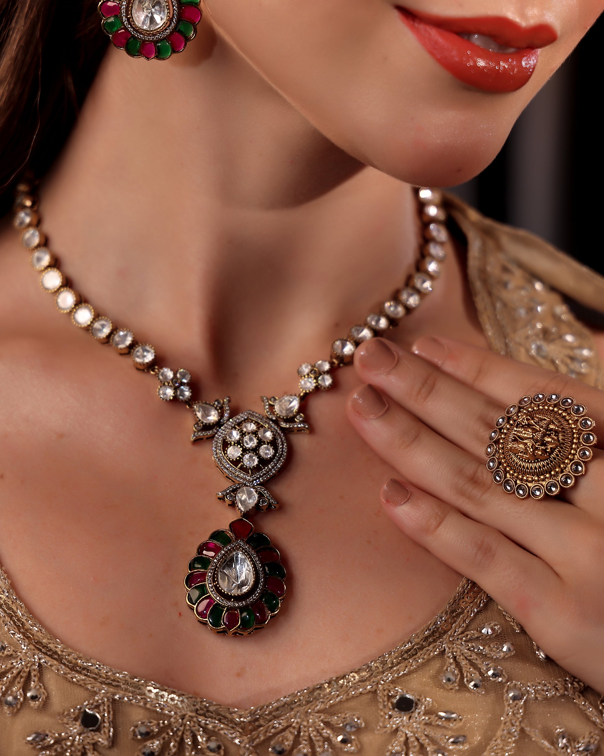 ◦ Earrings mimic the focal pendant, completing the look with perfect harmony
