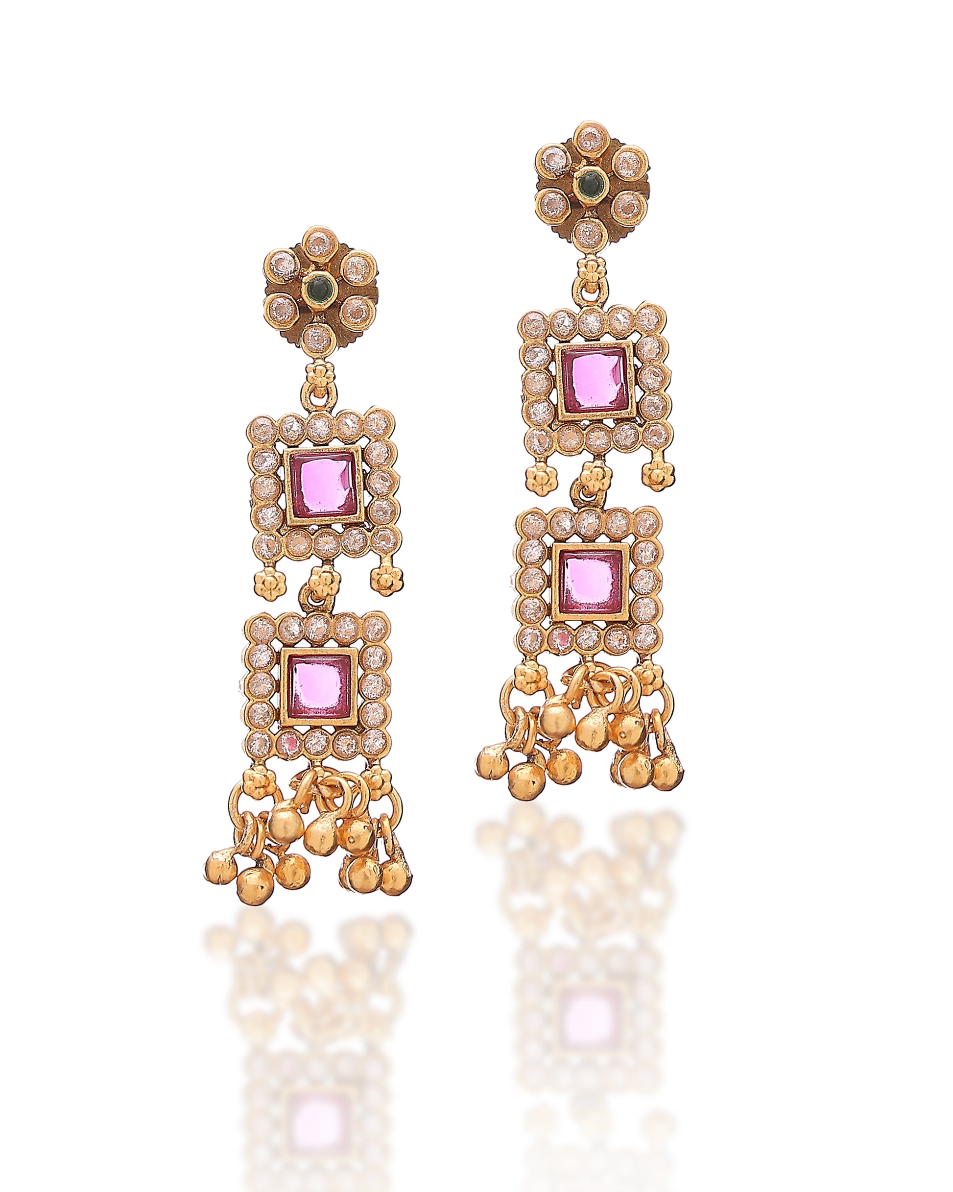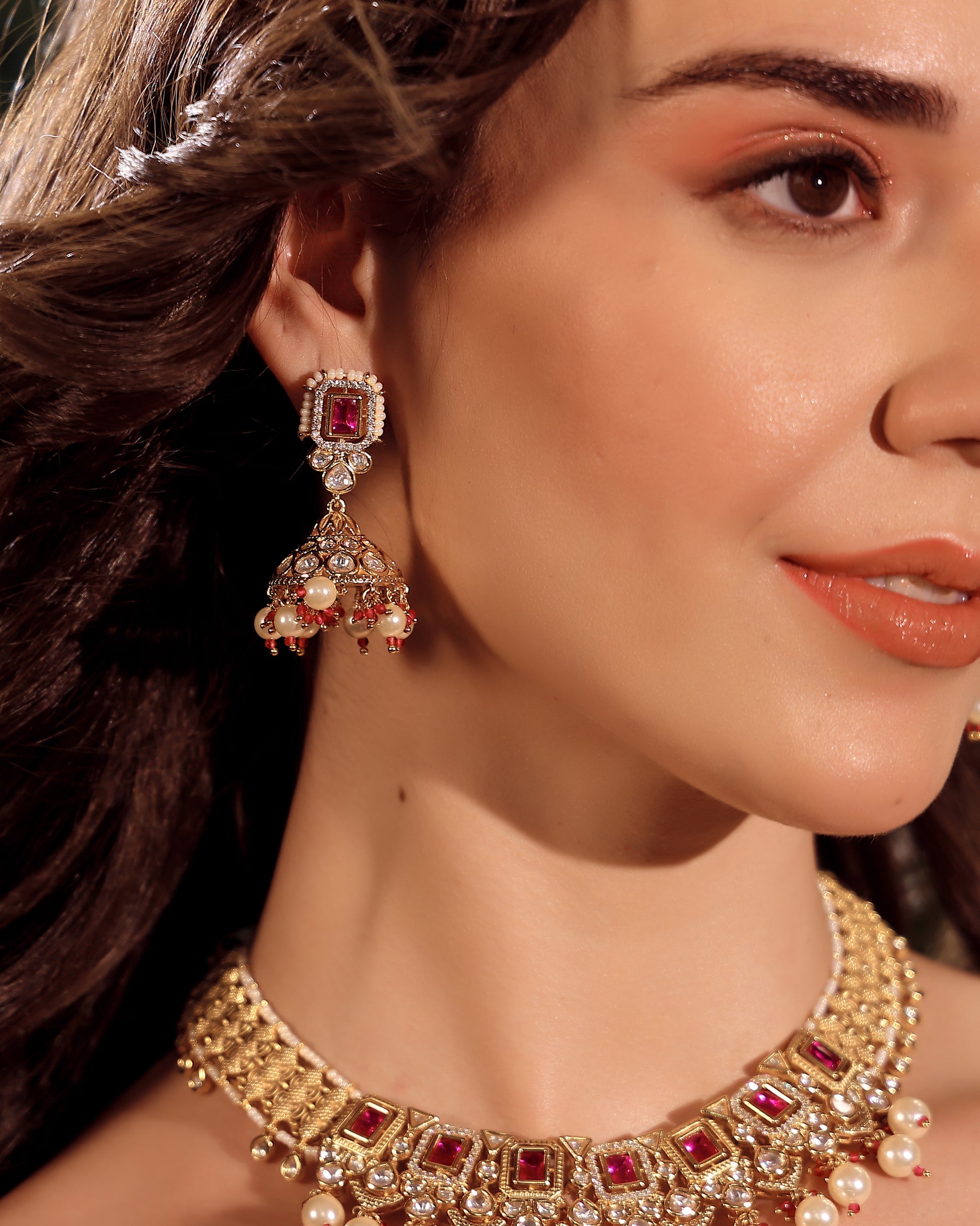 Elevate a silk saree, bridal lehenga, or even a fusion gown with this set. Wear your hair up in a sleek bun to allow the earrings and neckline to shine through, and opt for deep-toned lips to echo the regal pink stones.