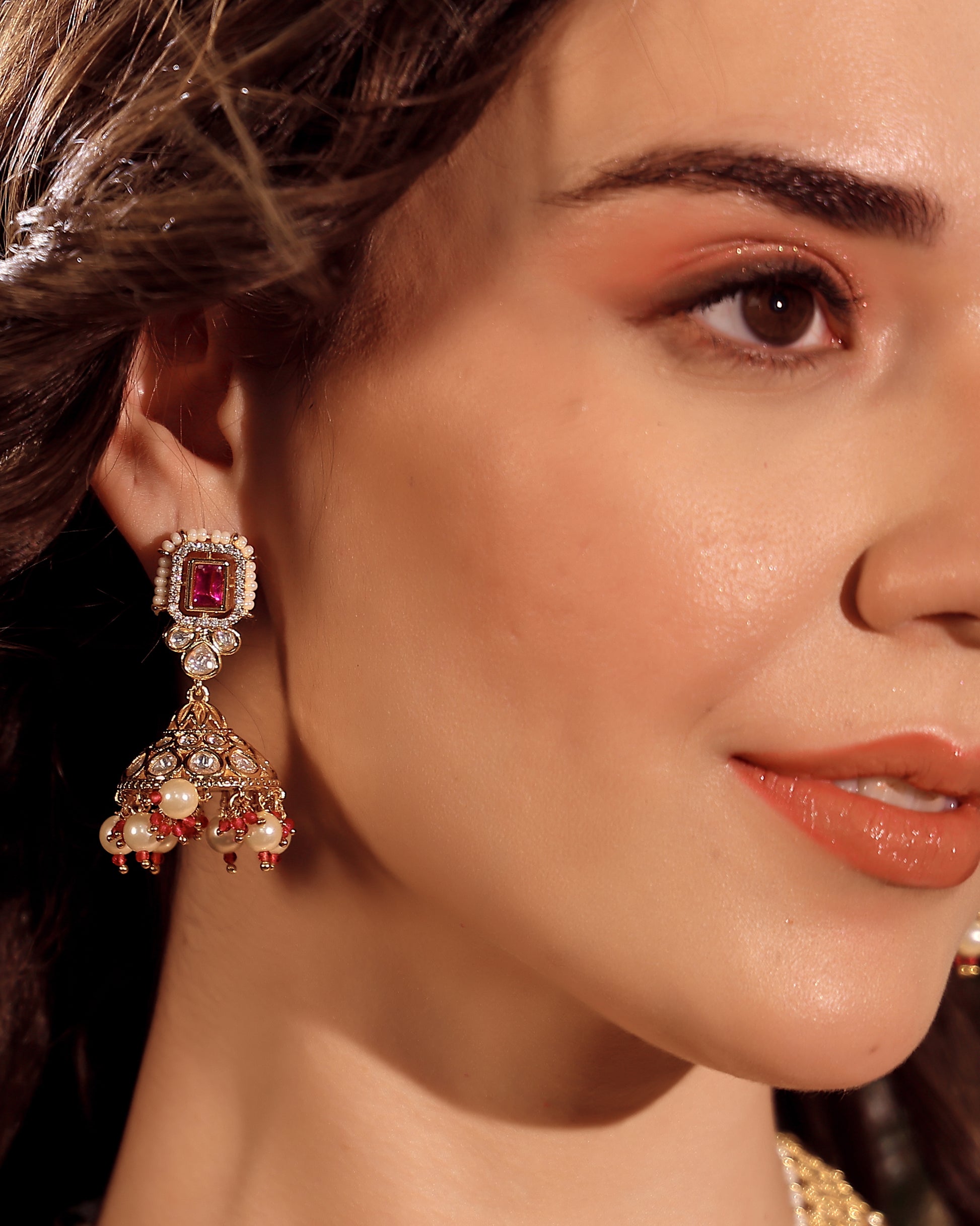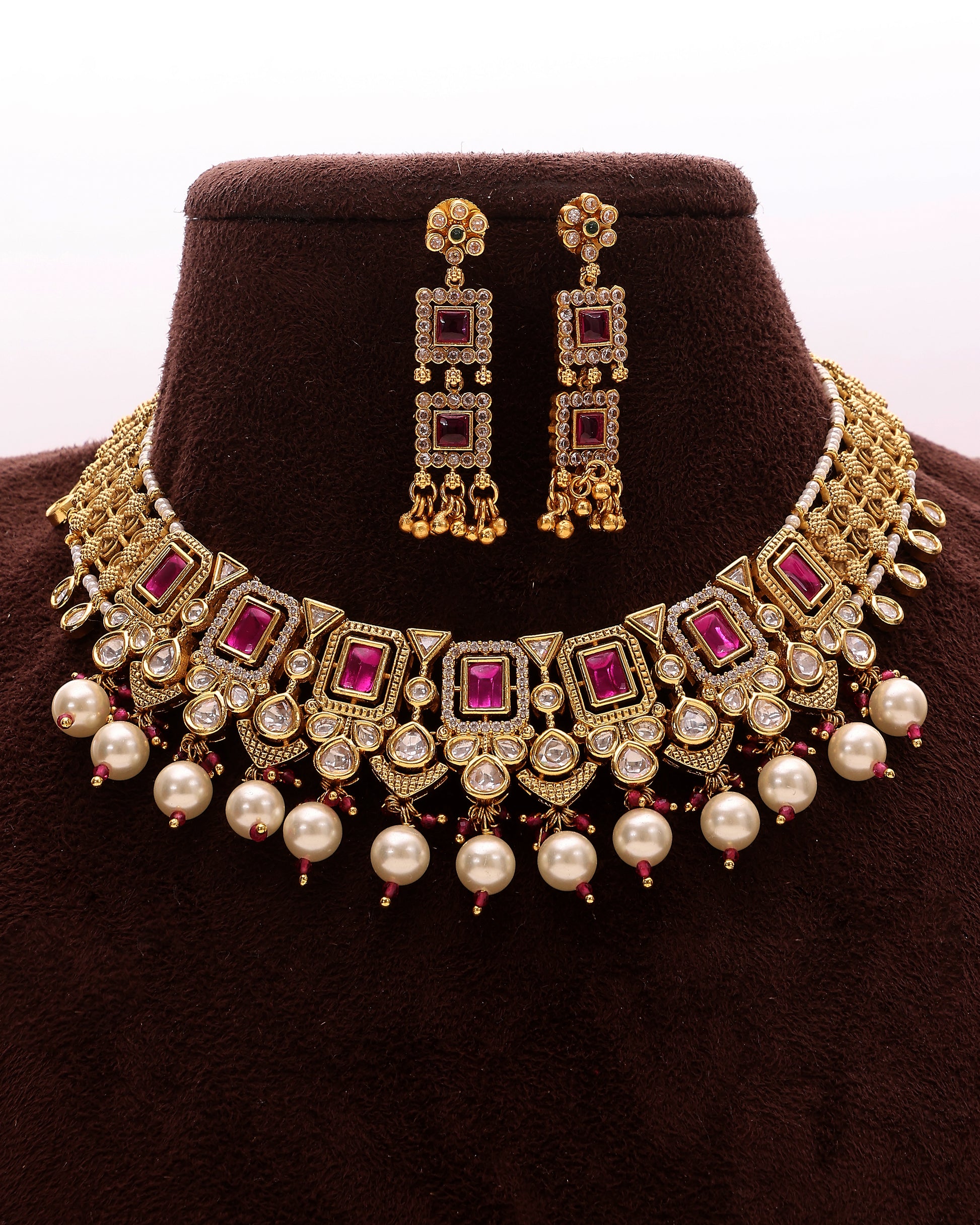 The Rani Regal Choker is a tribute to the grandeur of Indian royalty. With a design reminiscent of temple heirlooms, it features a line of luminous moissanite stones framed in antique gold, accented by deep ruby-pink rectangular gems. The choker is bordered with a graceful fringe of round pearls that sway delicately with movement, exuding timeless opulence. The coordinating long-drop earrings add just the right measure of elongation and elegance.