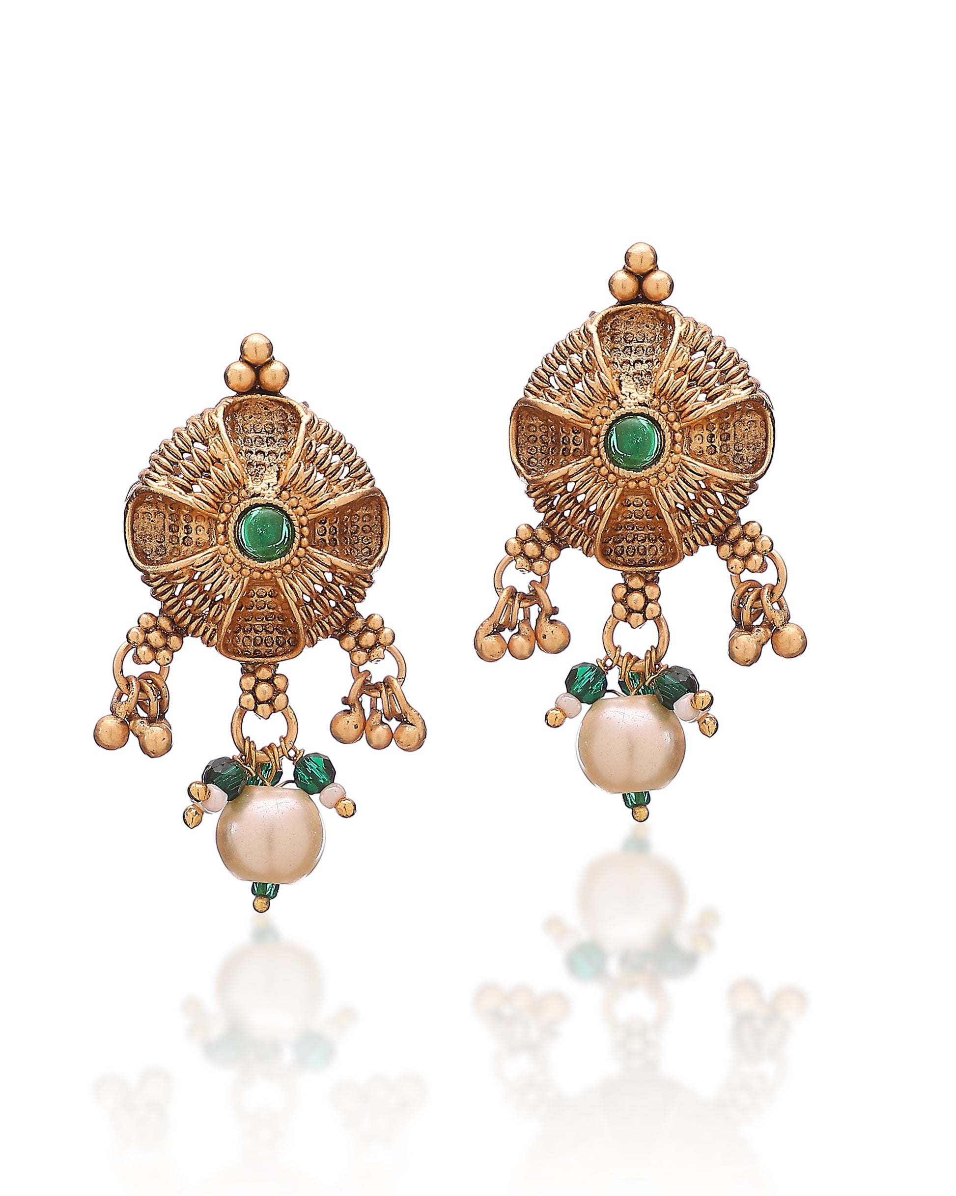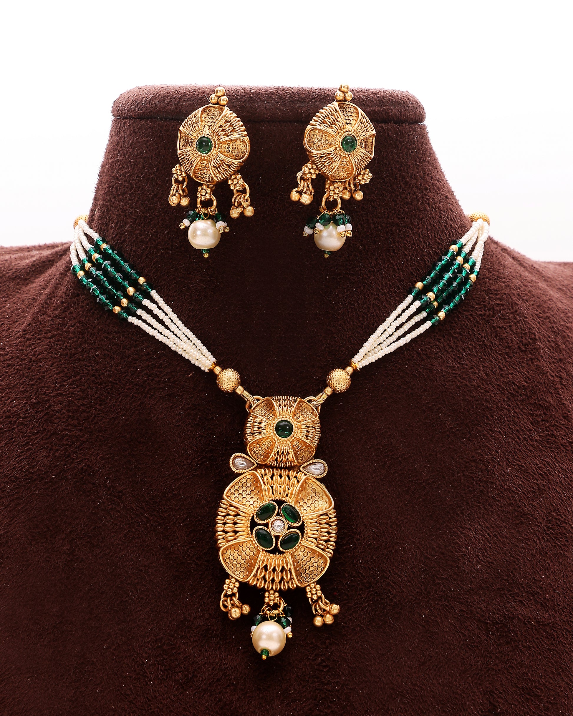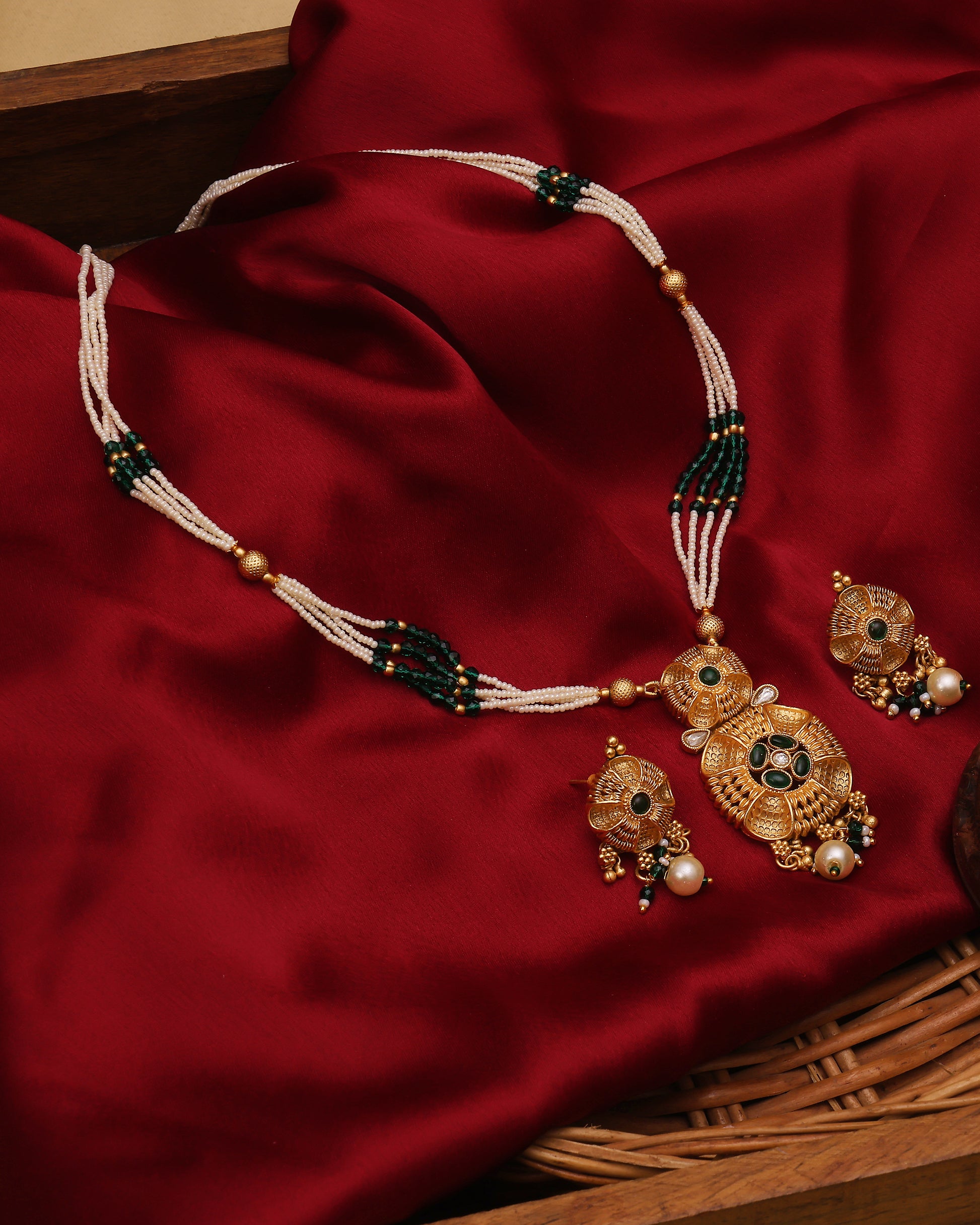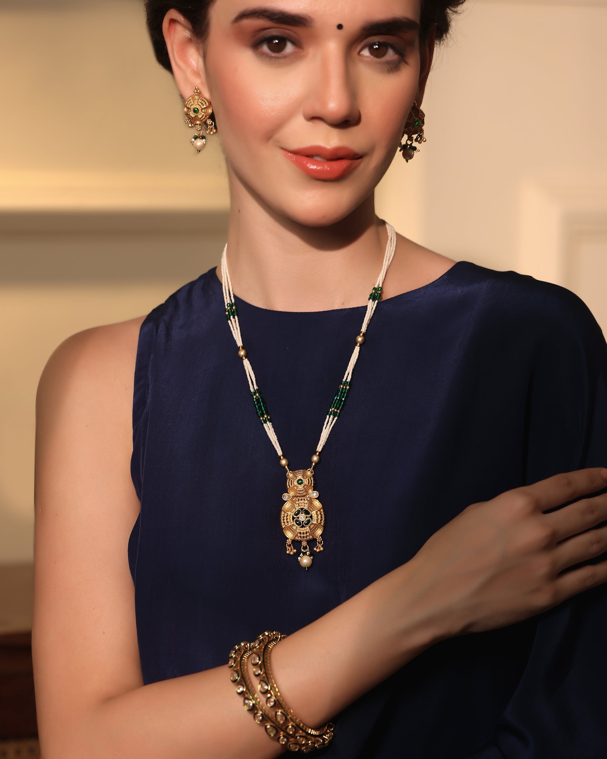 Blending classical South Indian temple motifs with a layered beaded silhouette, the Regal Trance Temple Fusion Set is a divine statement of heritage and sophistication. Perfectly handcrafted, the pendant and earrings carry intricately carved deities, ornate florets, and traditional embellishments, evoking a serene regal charm.