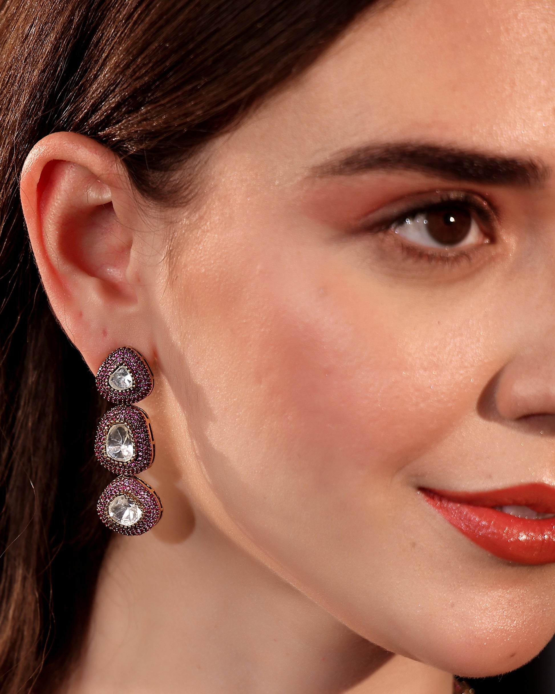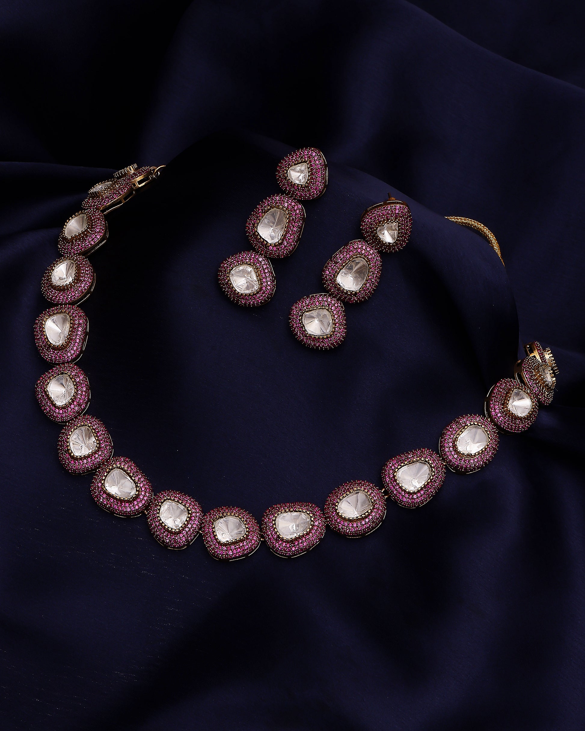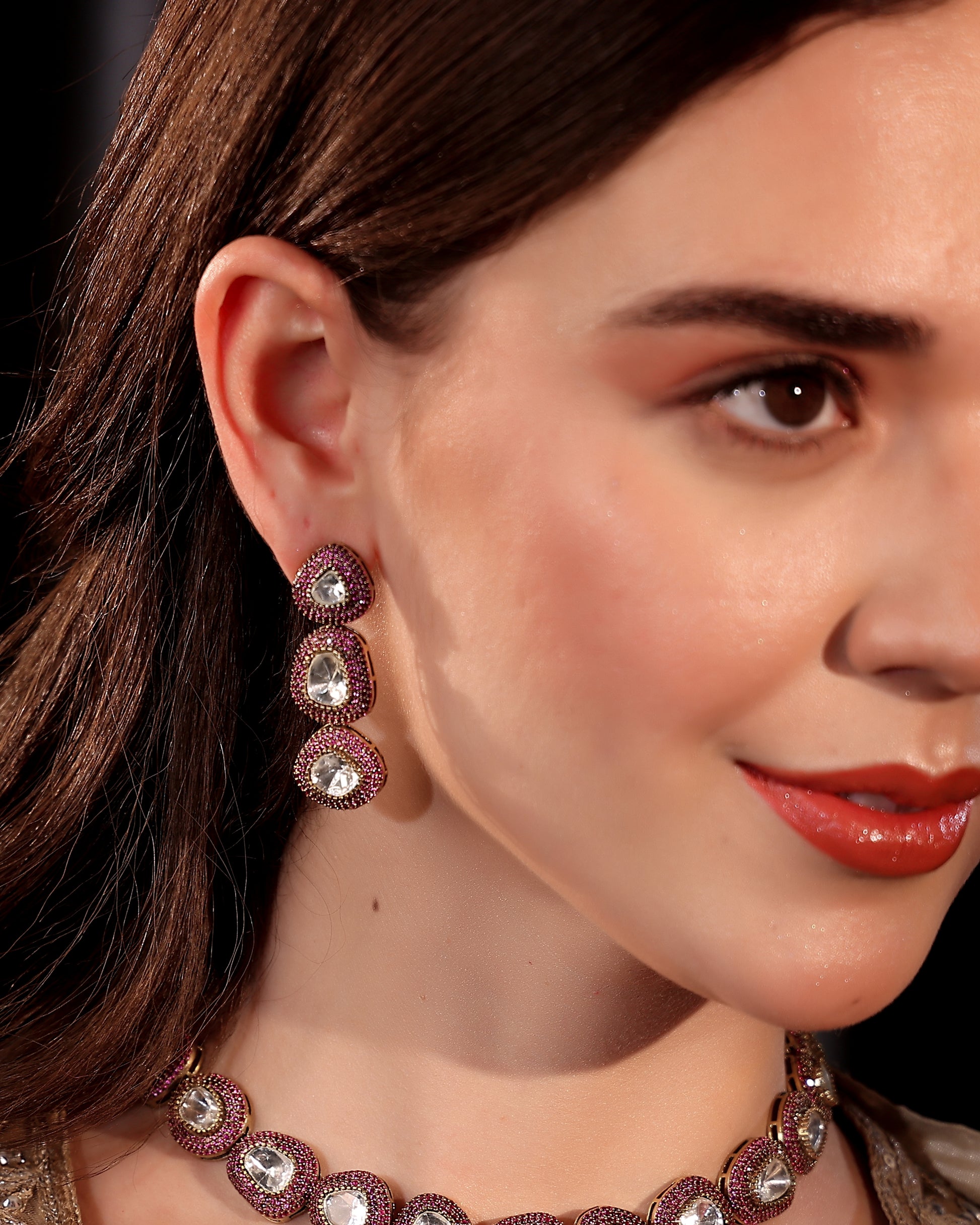 Turn every gaze your way with the Rosé Luxe Moissanite Glam Set, a radiant ensemble crafted to dazzle under candlelight and chandelier alike. Each piece showcases glimmering rose-cut moissanites nestled in halos of deep pink pavé stones—offering a perfect blend of sophistication and glamour.