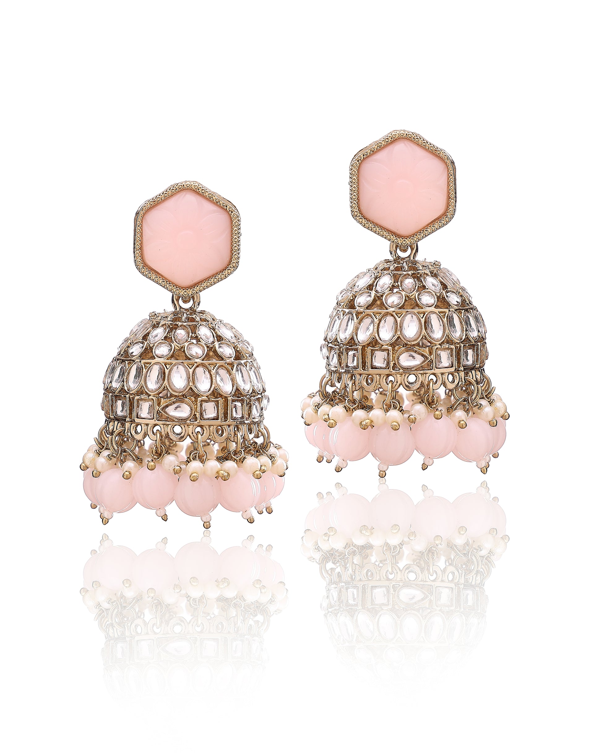 Hexagonal blush-pink carved stud with a traditional dome-shaped jhumki adorned with kundan stones and finished with dangling pink beads.