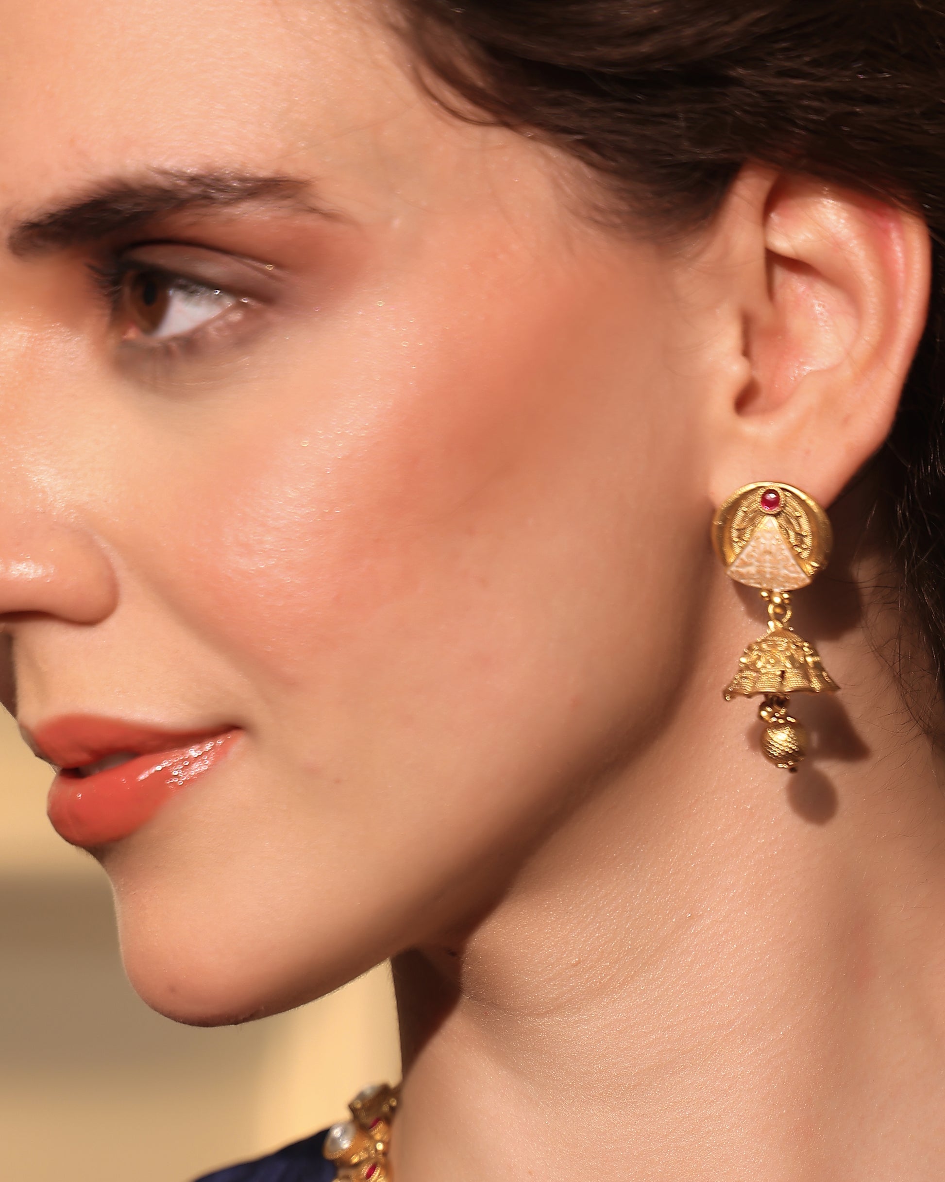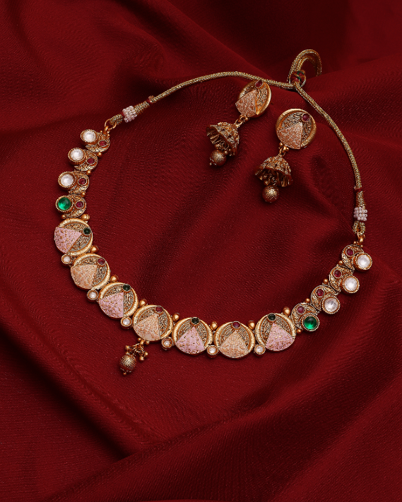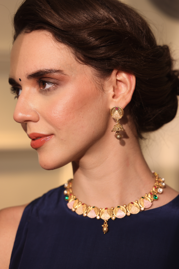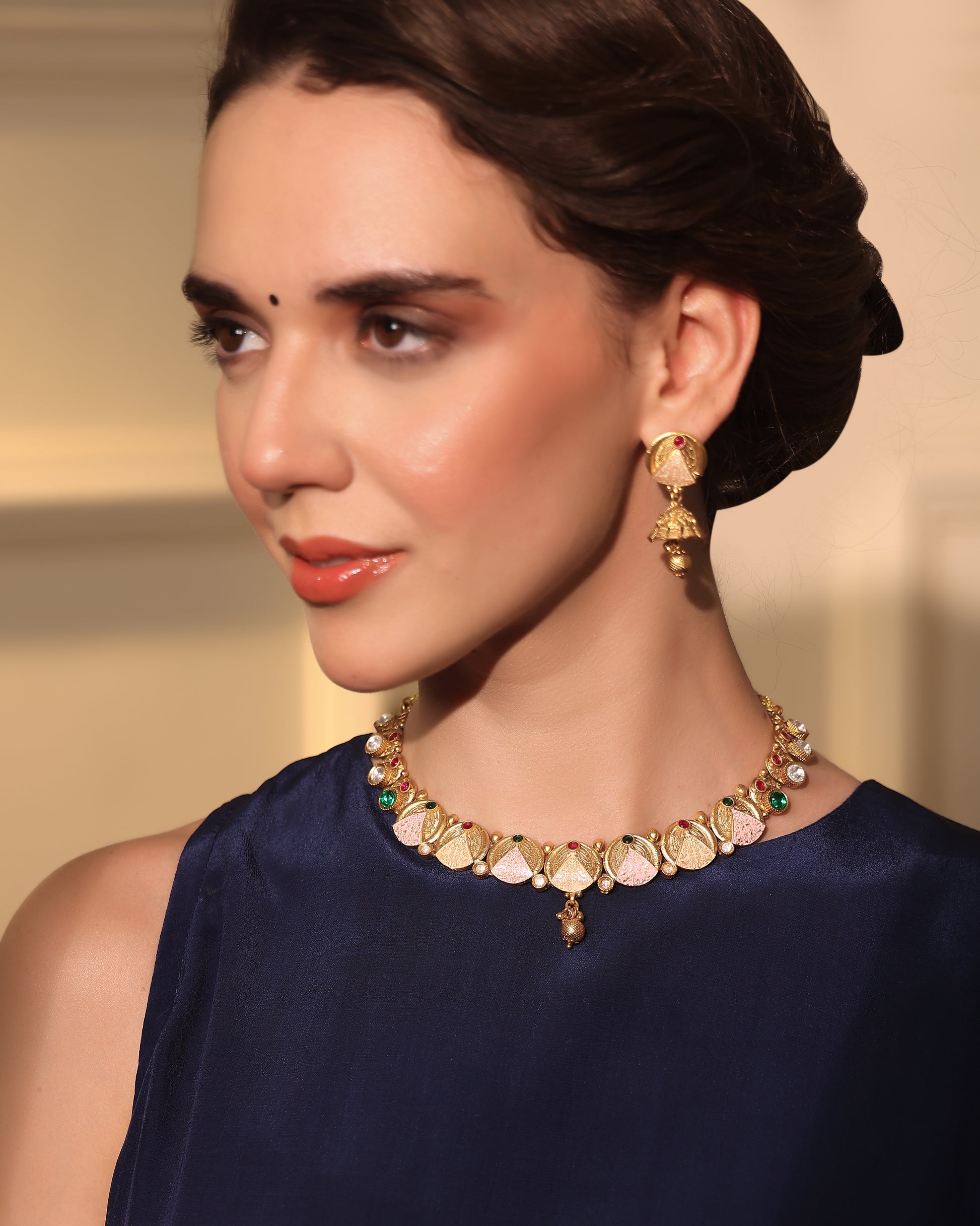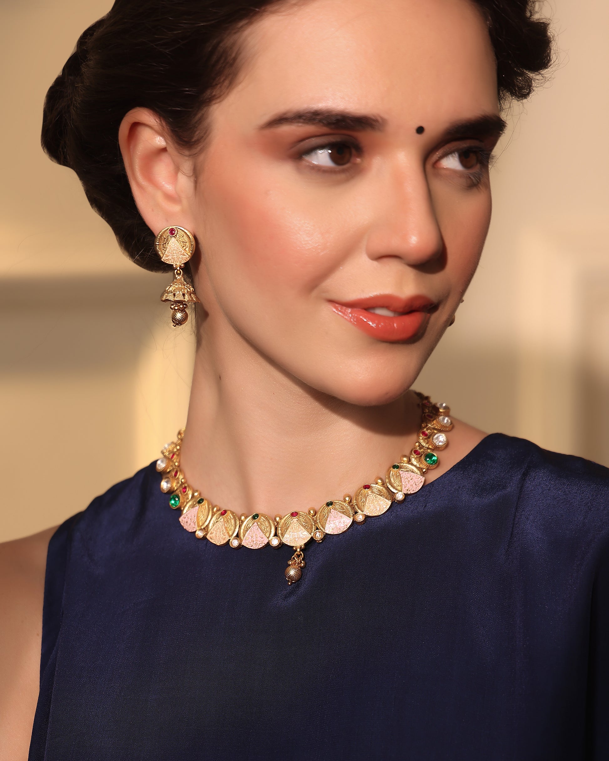 The Varnika Etched Enamel Temple Set brings divine elegance to modern heirloom jewelry. Featuring alternating fan-shaped medallions with pastel enamel detailing and embossed temple motifs, this necklace is a homage to South Indian heritage. Ornate jhumka earrings echo the craftsmanship with intricately carved domes and ruby-studded accents. Finished with a classic antique gold polish and accented by pearls, emerald green, and deep ruby stones, the set evokes both regality and spiritual charm.