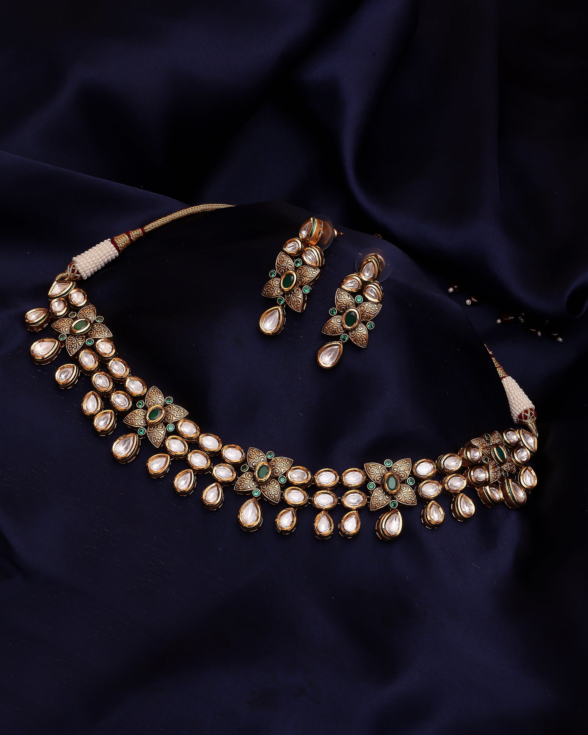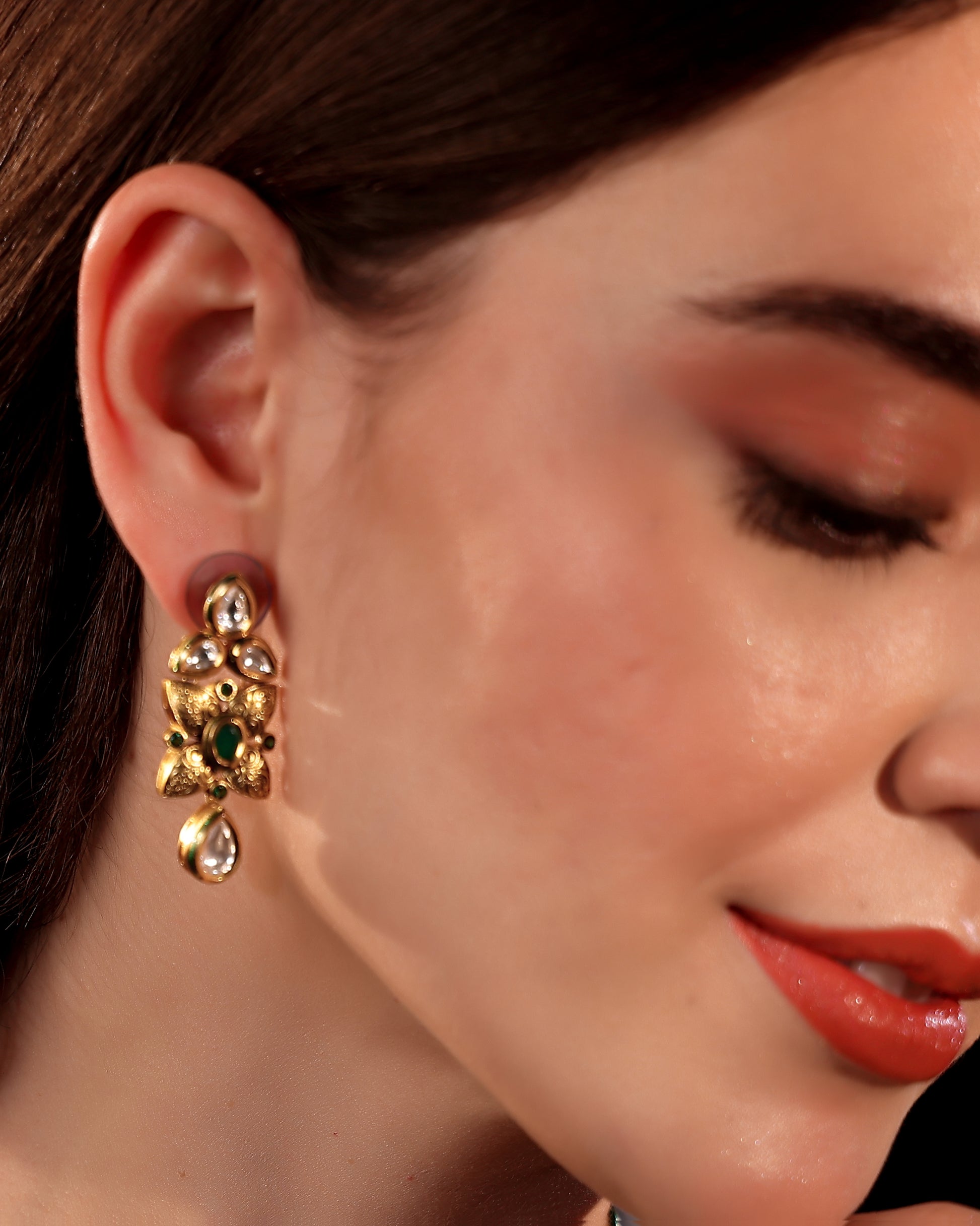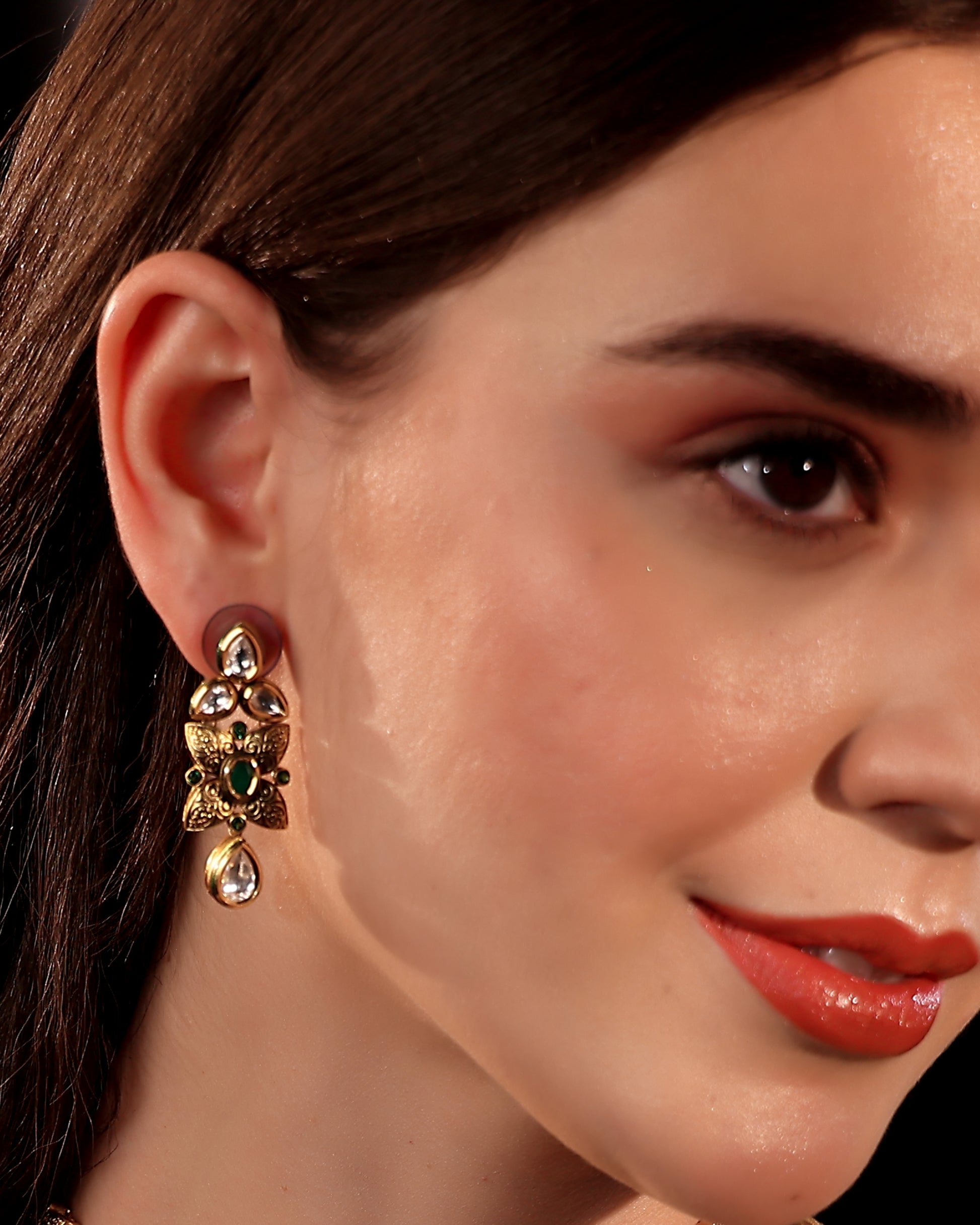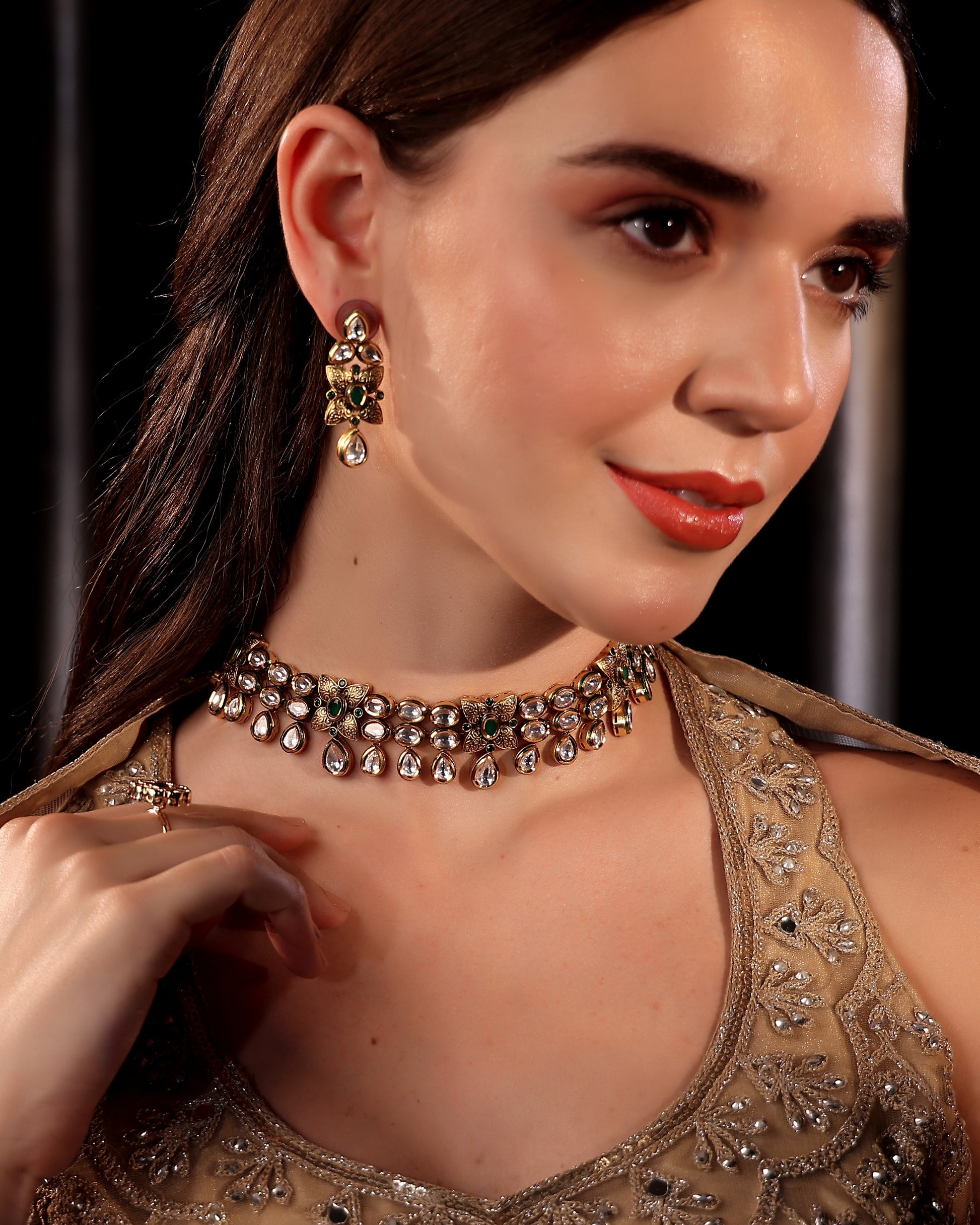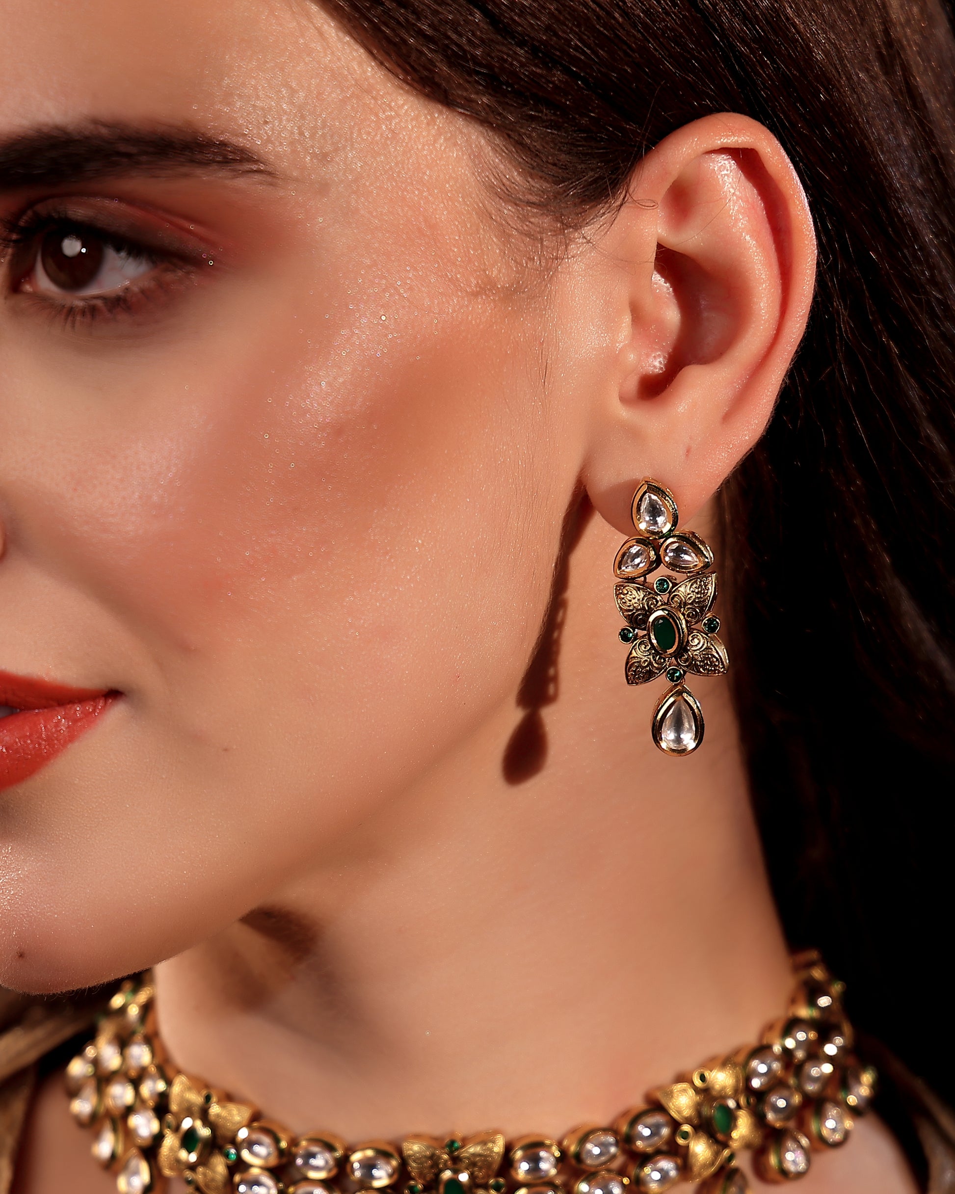 Step into a world of regality with the Verdant Bloom Moissanite Grandeur Set — a stunning ode to Mughal-inspired floral motifs and contemporary finesse. This luxurious set brings together the brilliance of moissanite with the richness of green stone accents, handcrafted into a necklace that blooms with timeless charm.
