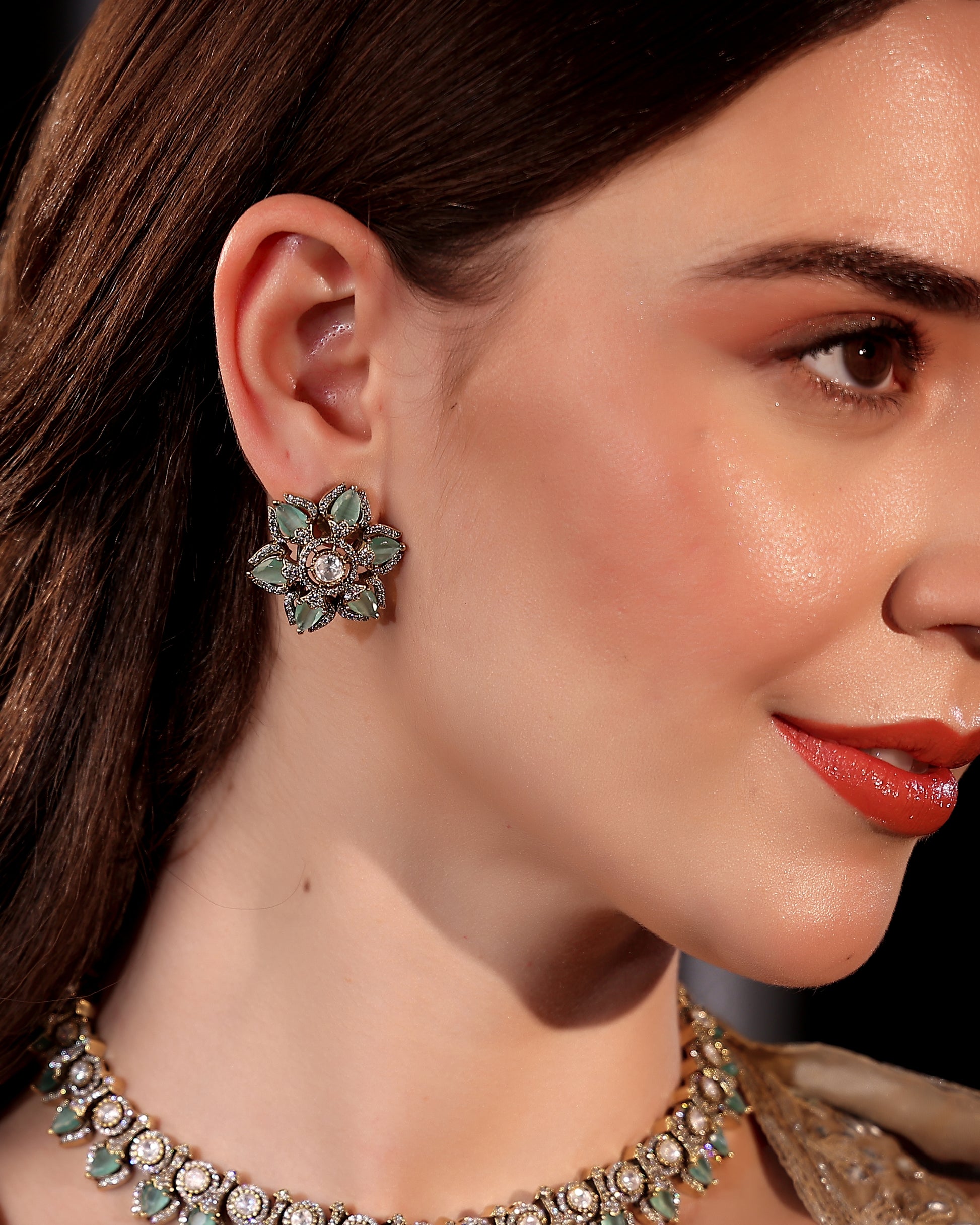 Gracefully nestled between Victorian refinement and modern sparkle, the Victorian Green Stone & AD Choker Set is a blooming beauty. This intricately crafted set features dainty green petal shaped stones and American diamonds arranged in a floral vine, ideal for adding an ethereal touch to your festive or bridal wardrobe.